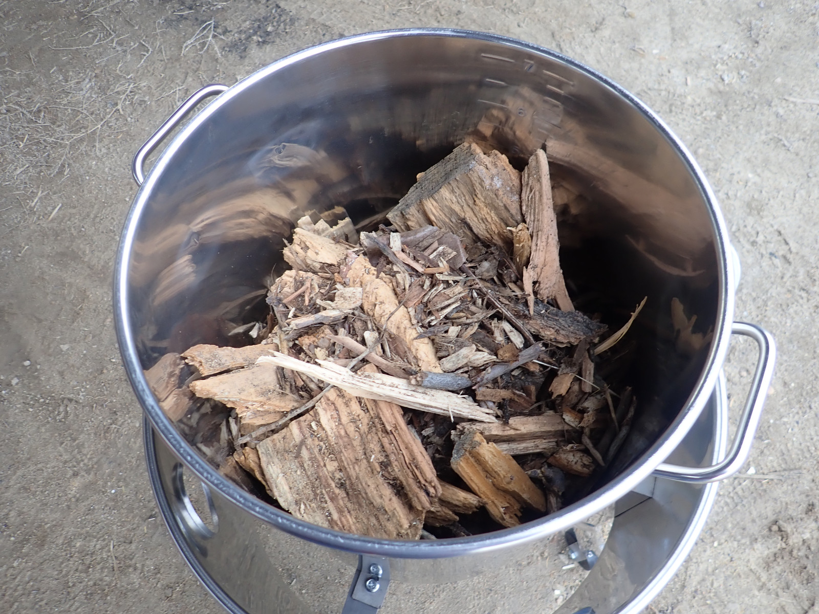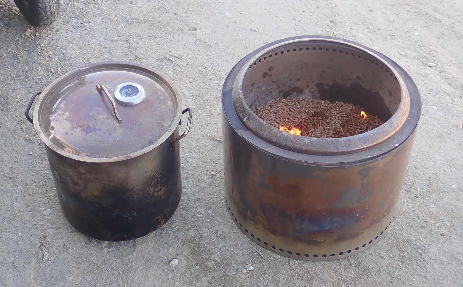 My first Solo Stove grate burned out - I was able to get a warranty replacement for normal firepit work, but I’ve also got the pellet insert. Some experimenting with fit indicated that I’d still have a small gap between the larger pot and the edge of the ring. Will it work? Time to experiment! I put about two inches of pellets into the bottom of the stove, ignored every warning that says “Don’t light this with kerosene” and lit it with kerosene, and waited for things to catch. Interestingly, if you’re trying to light pellets, putting a couple tumbleweed in while it’s starting off really helps get things going - the combination of draft and reflected heat seems to do a marvelous job.
