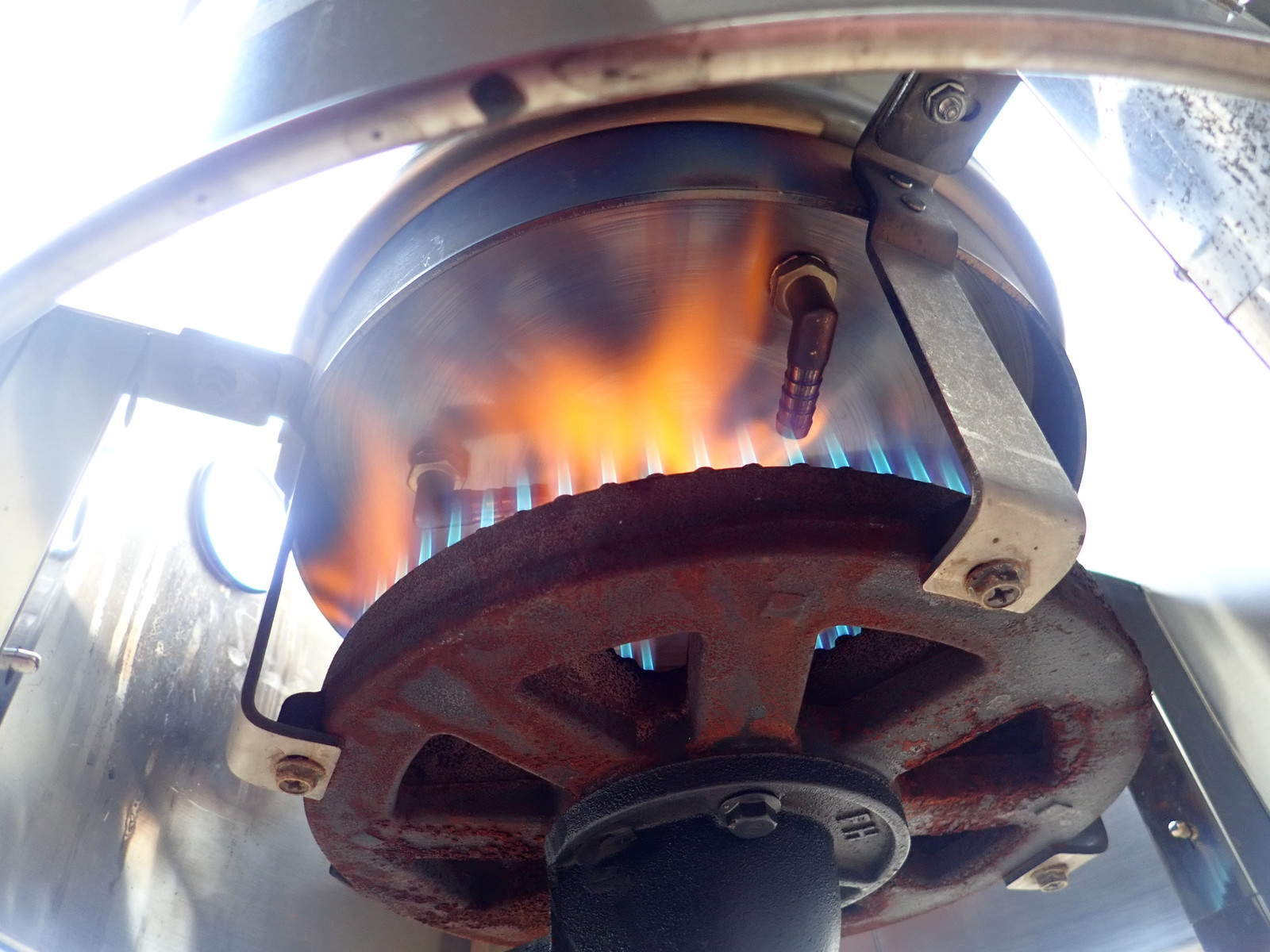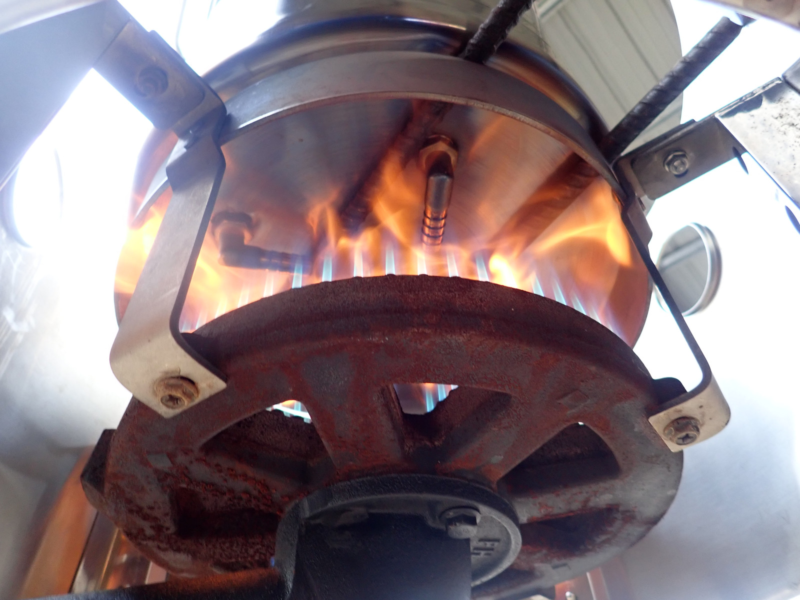 One of which involved just setting the pot directly on the burner! The stainless steel elbows provide some of the lift needed so the flame can burn under it, and… hey, maybe this will work. Initial results were promising, with some pretty good orange flame (which isn’t propane) coming out in a hurry.