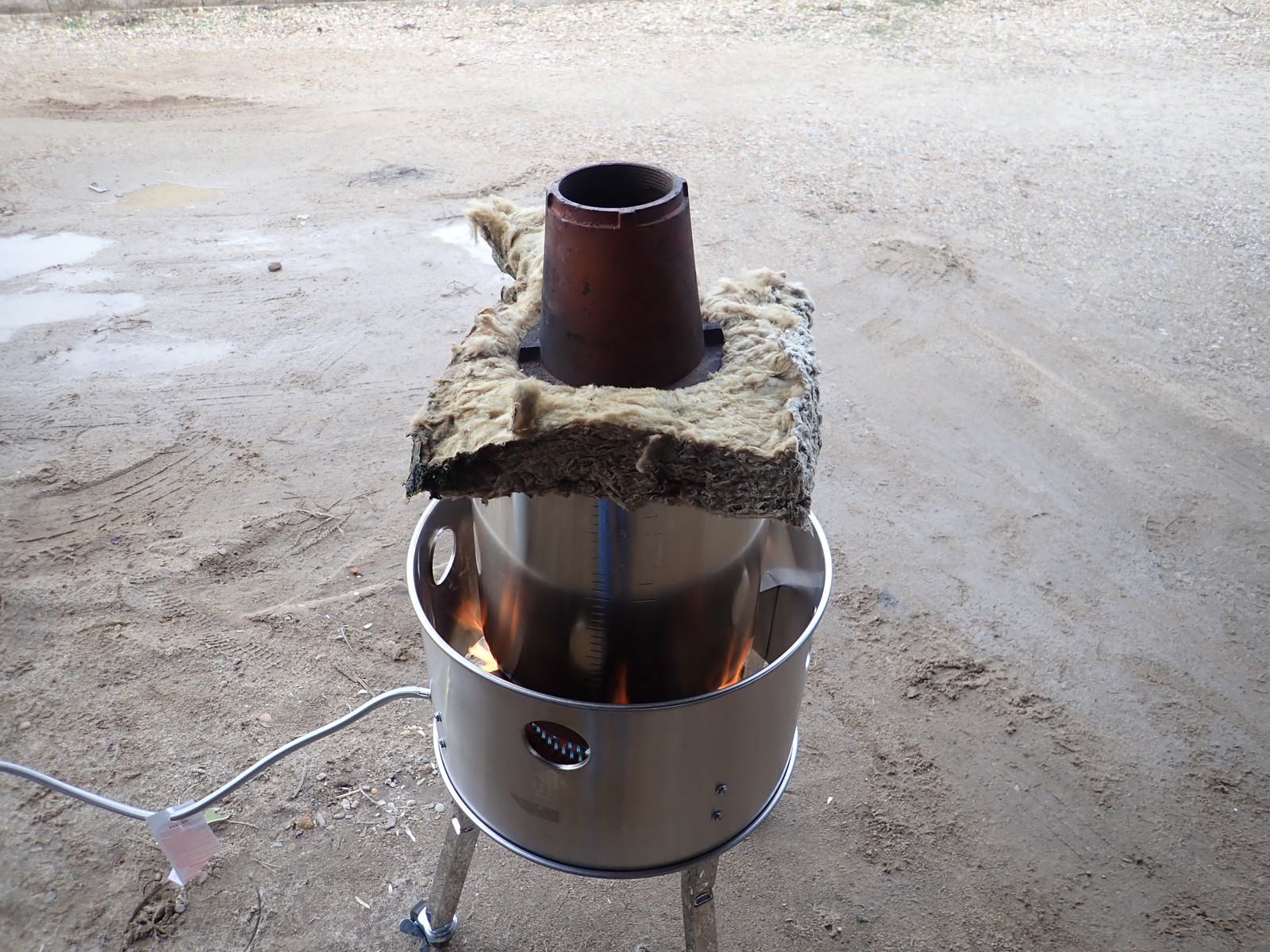Heat loss is my enemy here. It’s far too hard to keep the pot hot enough, long enough, so I’ve added some rock wool insulation from back when I built my office. Right now, it’s just on the top (with a weight to keep the lid pressed down except for overpressure venting), but I plan to insulate a lot more of the pot over time with this stuff and work out the details of how to keep everything really warm for long periods.