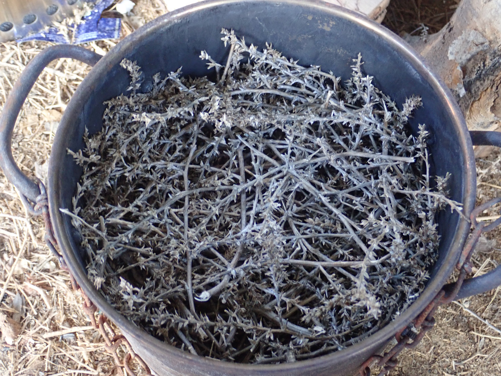 Another little bit of experimentation I’ve done is what I’m calling the Tumbleweed Special. If you stuff a pot full of tumbleweed, it charcoals down just fine, and you end up with a nice fine bit of very cooked charcoal - out of something that’s otherwise a genuine nuisance around the hill! If the wind gives you tumbleweeds, make charcoal!
