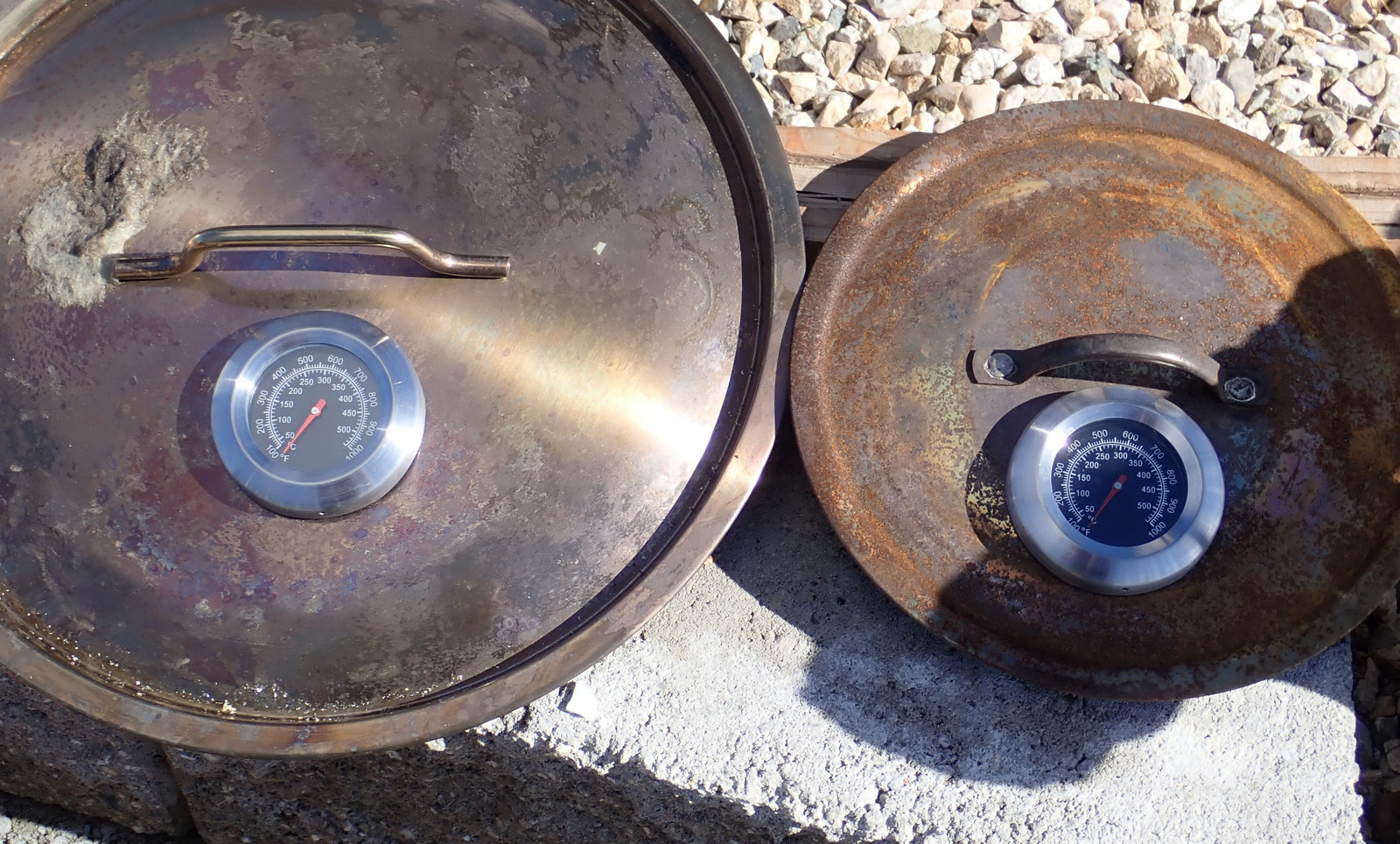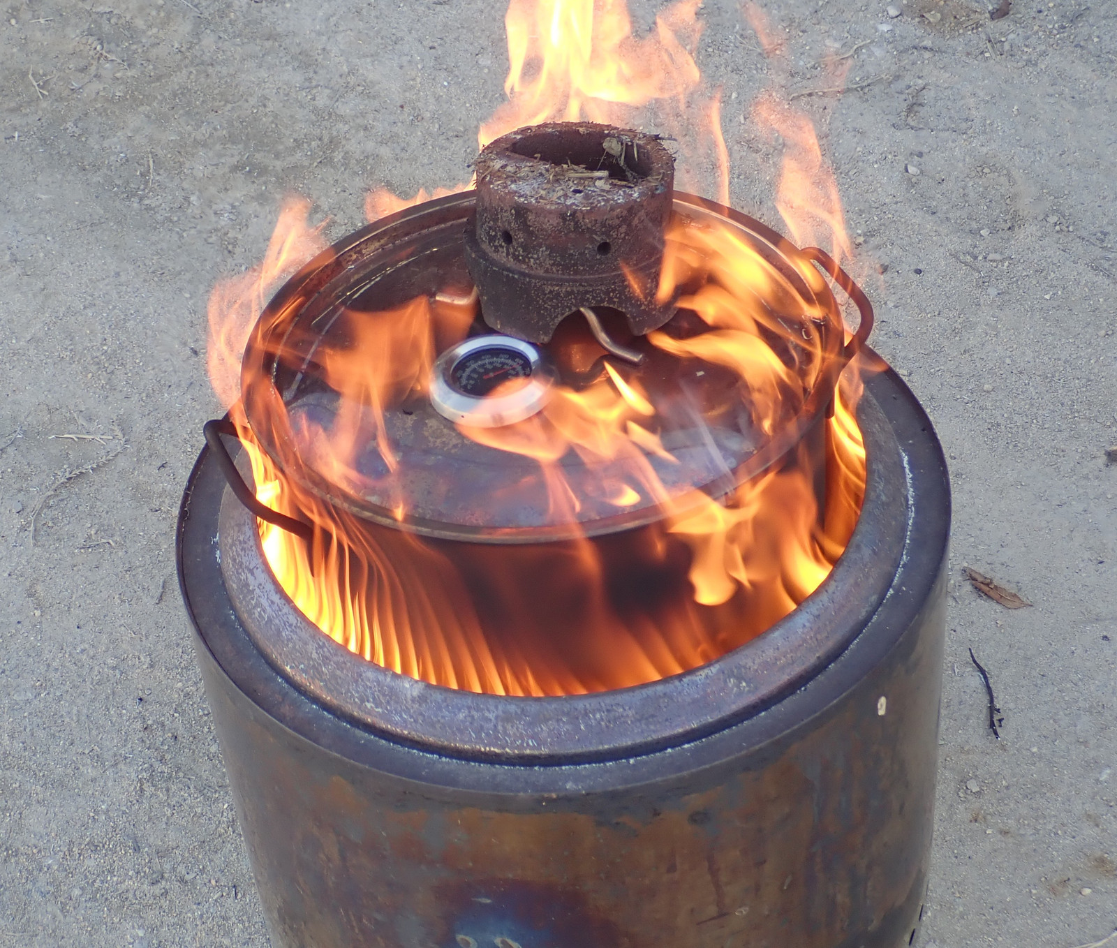 So I found a few high temperature BBQ thermometers, reading up to about 550C or 1000F, and I’ve installed them in pot lids to see how hot things get inside!