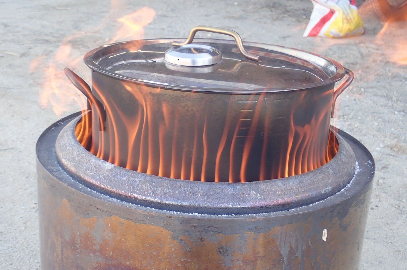 The pot went in, and pretty soon things started happening that were quite encouraging. Flames licked up the sides, and before long it was clear that the temperature was rising quickly, and that I was burning vented gases off - both at the base from airflow through the grate, and up high, from the secondary burn airflow - which directed the tongues of flame right into the pot.