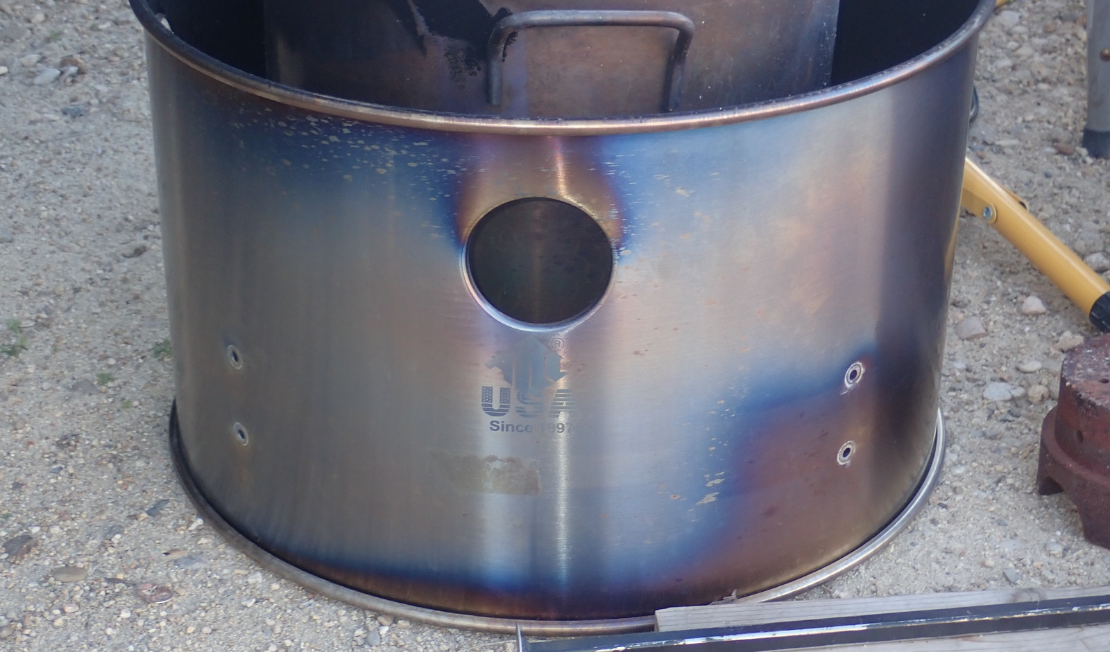 The ports through the side serve rather effectively to let me see the process of the venting - though the camera rather exaggerates the amount of red coming off the ring. It was red, just not this red. But the flames vent around the base of the pot and heat everything up exactly as desired!