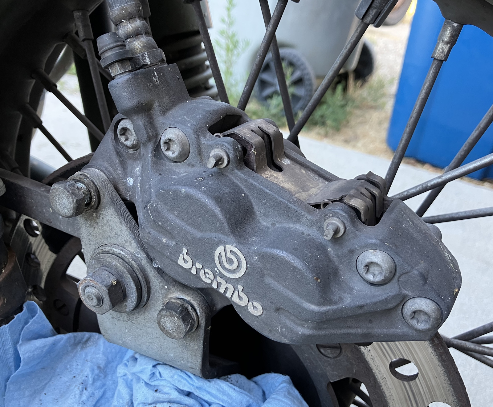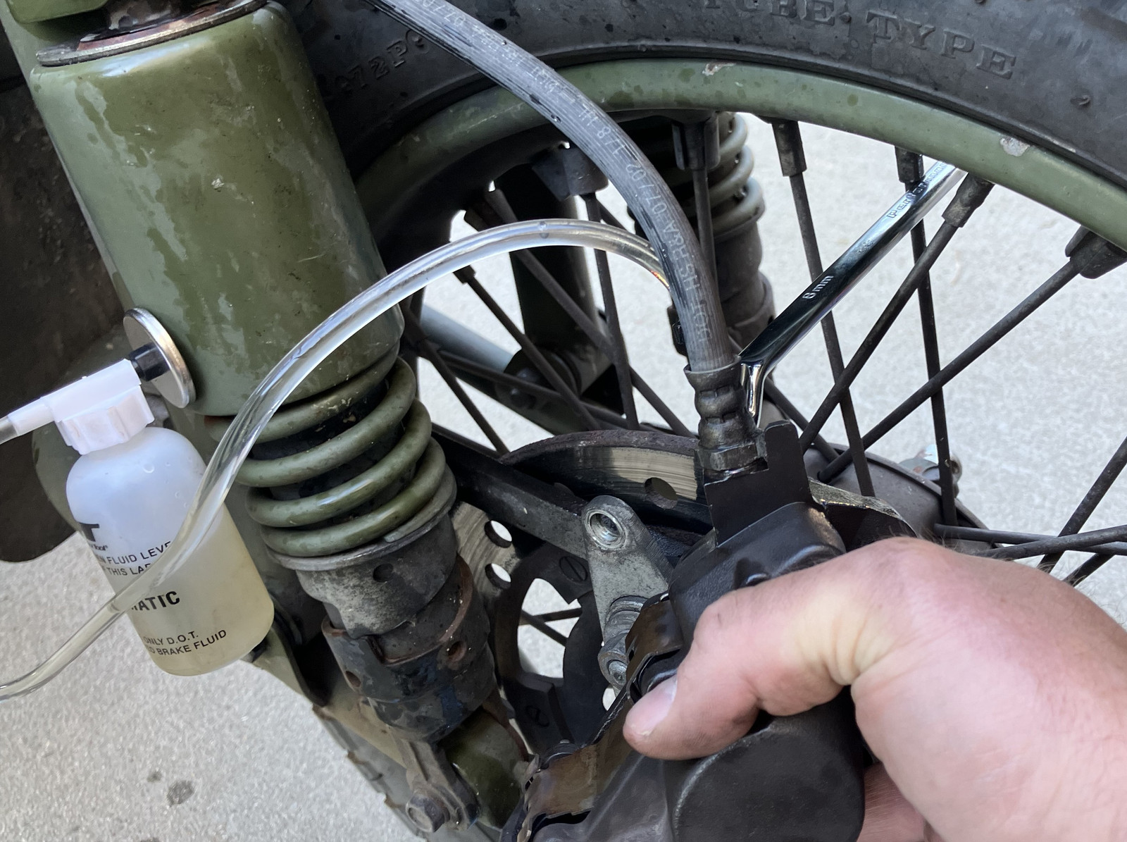 I am in the habit of loosening the bleeder screw when I push the pistons back in. This is fine, until you forget to put a hose over it and it does the motorcycle version of “changing a diaper without covering the child,” and makes a tremendous mess all over everything. It’ll seem totally fine, right up until it decorates the motorcycle, pavement, and probably you with older brake fluid than you’ll admit to having in a brake system that ought be bled annually.