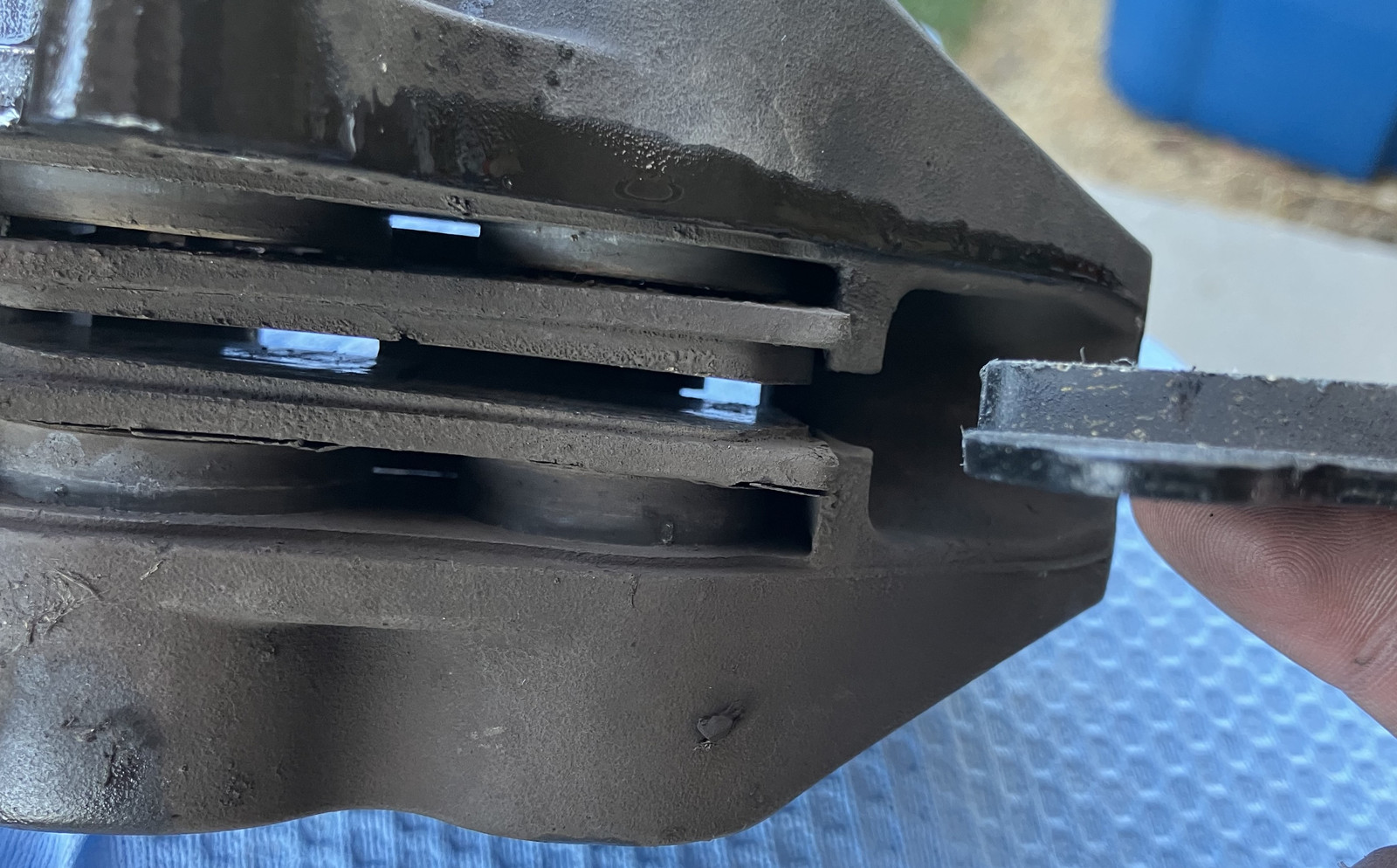 I’d been suspecting for a while that my pads were getting pretty badly worn. I didn’t realize they were quite this badly worn. Whoops. Not much time left to metal on metal noises. The new pad is on the right as a demonstration of the original pad thickness. The paper thin pad on the lower left is, shall we say, “almost entirely utilized.” And the uneven wear means I probably need to rebuild this caliper at some point, because it’s not applying pressure quite evenly to both sides. I should get around to that.