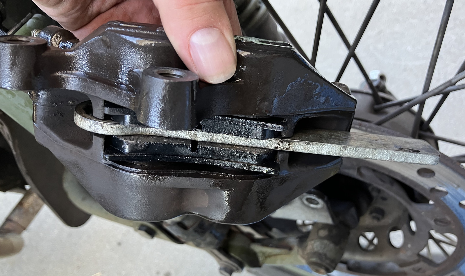 Done with the bleeder too loose, this will also let a lot of air into the system that will be basically impossible to get out. The caliper will not bleed properly on the bike. So, the solution is to bleed the caliper off the bike - but, also, you don’t want to just let the pads press into each other. You need something about the same thickness as the rotor - and, it turns out, the Ural toolkit (at least on my bike) has exactly such a piece! The thin wrench thing used for removing the nut on the rear axle is perfect to use as a caliper-substitute when fighting with the brakes! Put it in, and you’re golden. Just remember to hose everything down with brake cleaner before you put the brakes back together.
