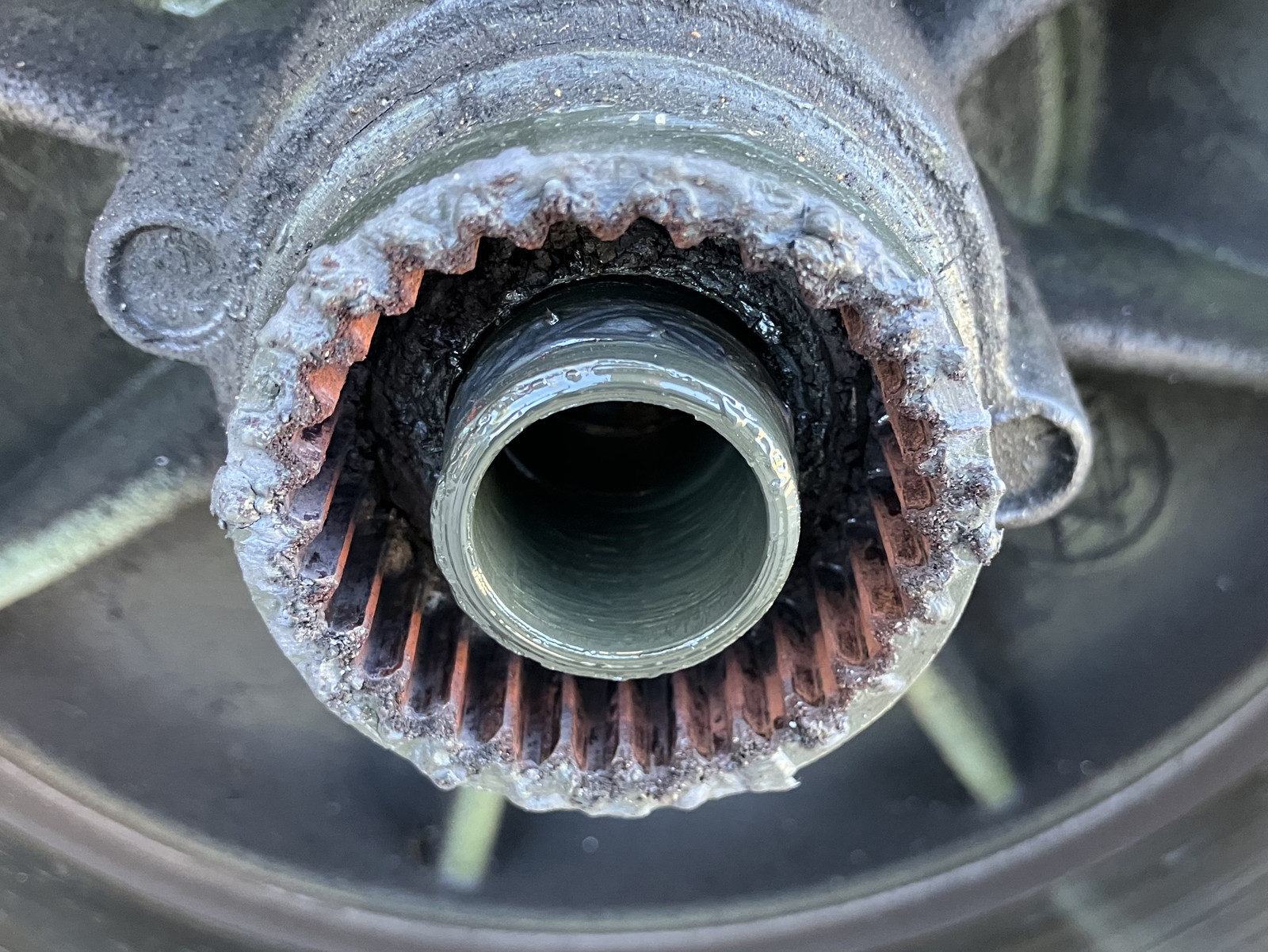 Why should you grease your splines? Because if you don’t, they’ll wear and rust! I have no idea where this picture came from, but it’s someone’s pusher wheel, and some splines that are quite a bit drier than they ought be. Apparently someone forgot to lube the splines after replacing their final drive, and… anyway. Grease your splines, okay?