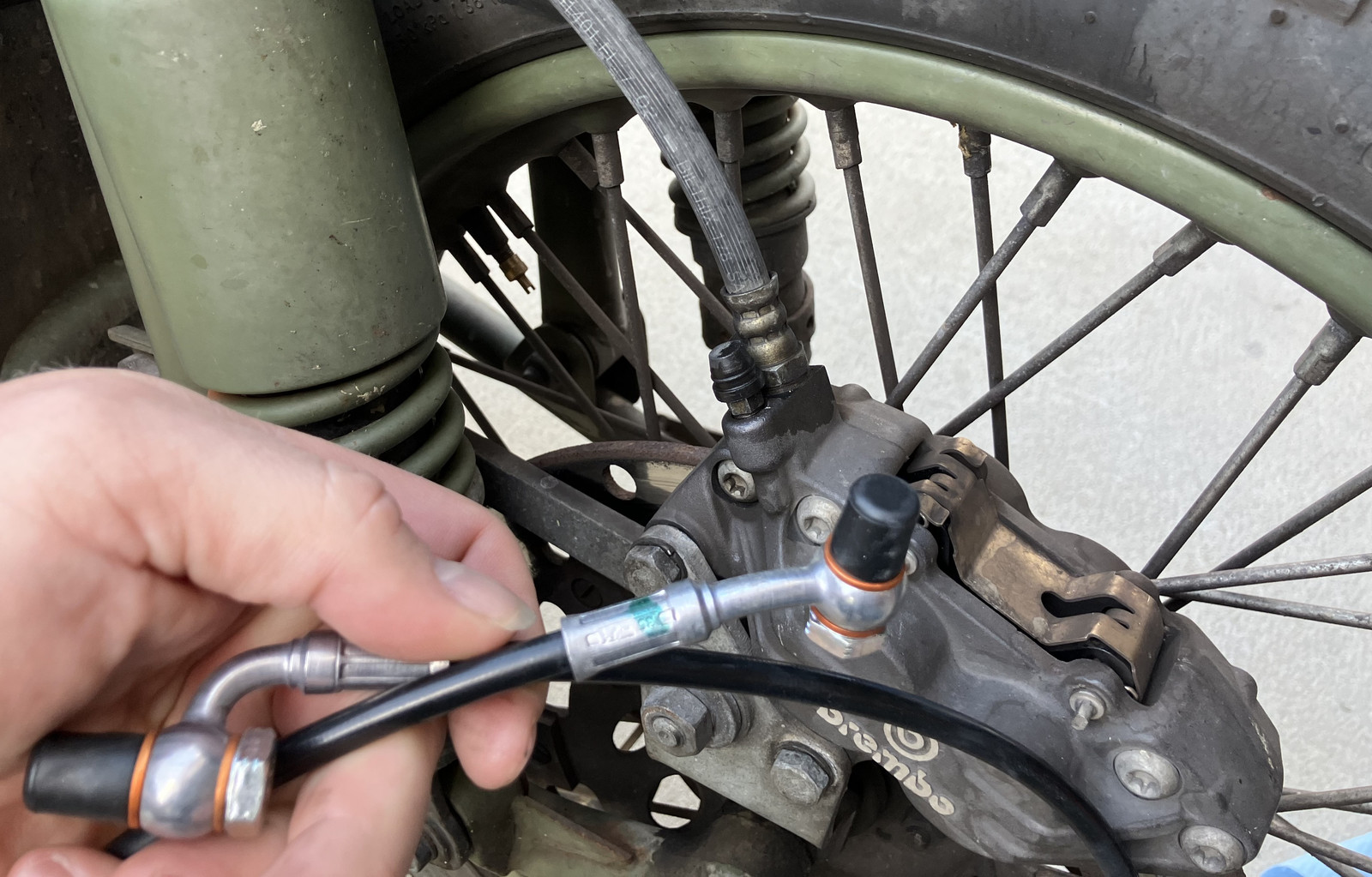 This is a Russian evolution of a German bike, so what size wrench do you need to get the line off the front Brembo caliper? If you said 5/8”, you’re right! That took some work to figure out, because it wasn’t 15mm, and it wasn’t 16mm either. The process is simple enough. Remove old line, install new line. Bleed.