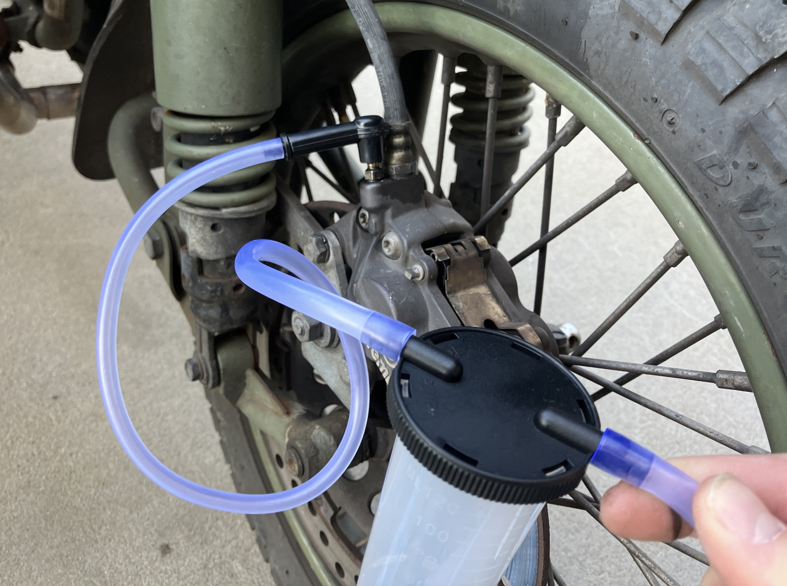 If you’re opening up a Ural front brake system, I can now state with experience that you will want a vacuum bleeder. This “sucks brake fluid and air” through the system, and makes your life a lot easier. Make sure you assemble the catch bottle correctly, or you’ll rapidly start sucking brake fluid into your hand pump. It is directional. Vacuum hand pumps don’t appreciate being doused in brake fluid.