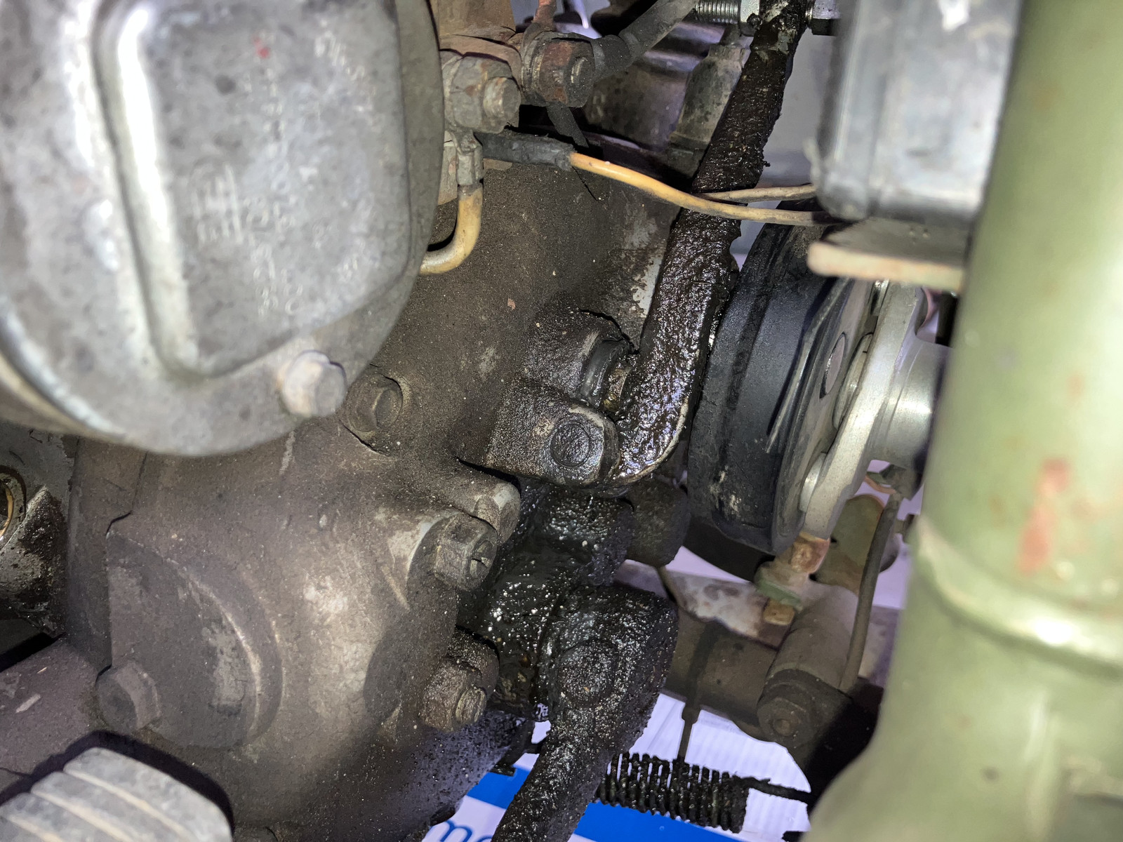 Cleaning things up is always a good start. If you’ve not stared at the back of a Ural (or suitably old BMW) gearbox before, the bottom green lever is the kick starter. I’ve wedged it down out of the way to work back here. Above that, slightly shiny, is the clutch pusher piston, and the lever pushing on that is the clutch actuation lever. Removing this is simple enough - there’s a cotter pin on the back of the rod it pivots around. Remove that, remove the rod, and remove the lever. If you’ve been clever, you’ll even have remembered to loosen your clutch cable before getting started to give you more slack to work!