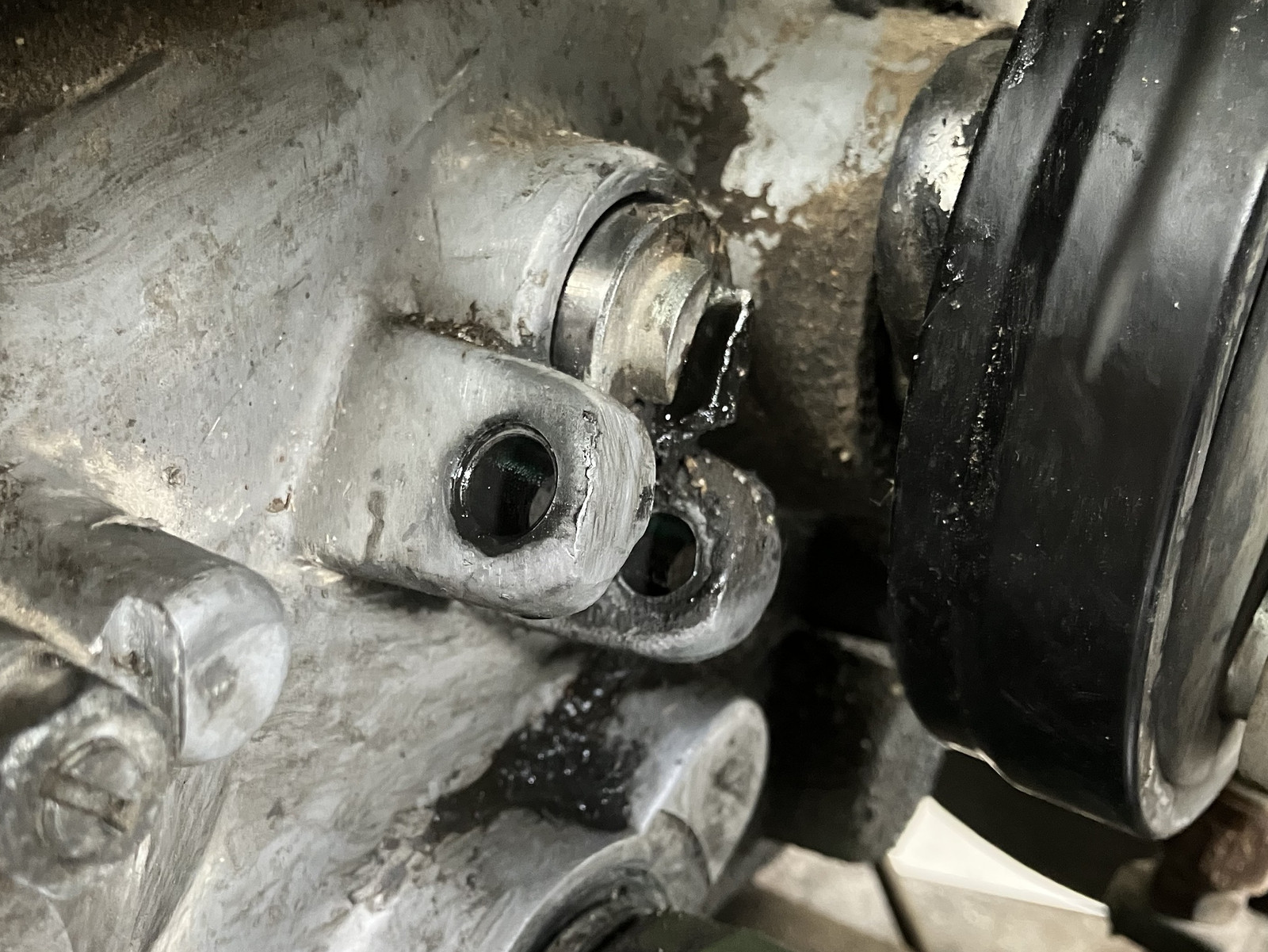 Keep an eye on the back of your gearbox. At some point in a Ural’s life, it will probably start looking something like this - not just the normal “dry-ish grunge” of a Ural, but actively wet, glistening glop. This is a good indicator that you’ve got a seal leaking somewhere, and the most common seal to leak back here is the o-ring on the clutch pusher. The mechanism is simple enough - a rod extends through the gearbox to the clutch to disengage it. You push this piston on the back, and a rod pushes out the front. There’s a bearing in here between the pusher and the rod that is a problem on the older bikes, but the seal on the piston will wear over time regardless of what you have as a bearing. When it gets too bad, it leaks, and makes a mess.