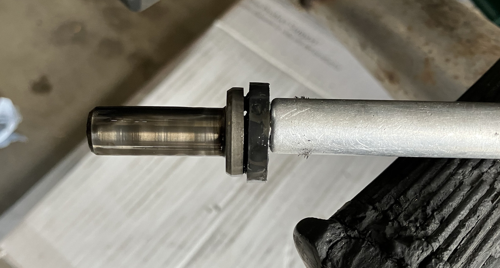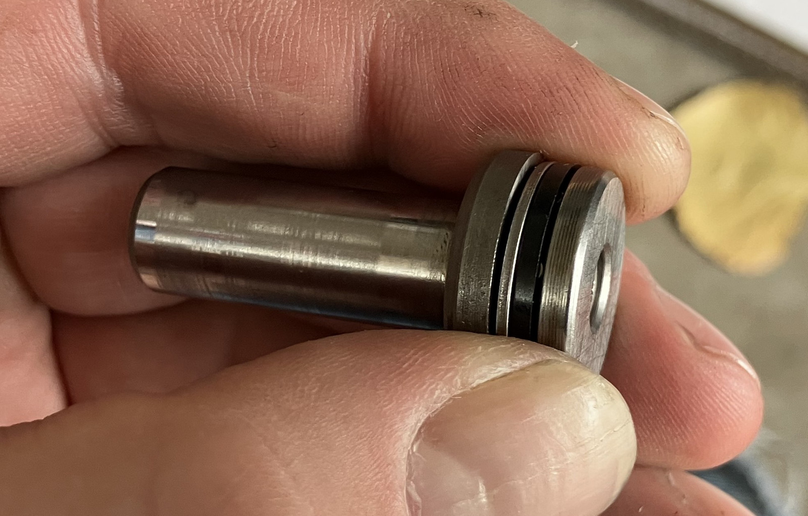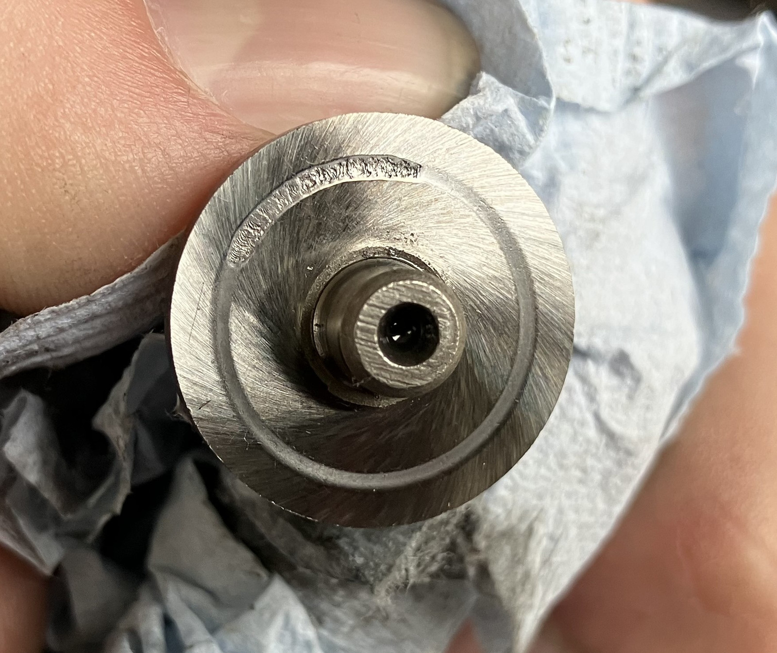 On the pusher piston, the only problem is that the wear is in a small ring. There’s no apparent damage to the metal yet. No, it doesn’t look particularly centered to me, either.