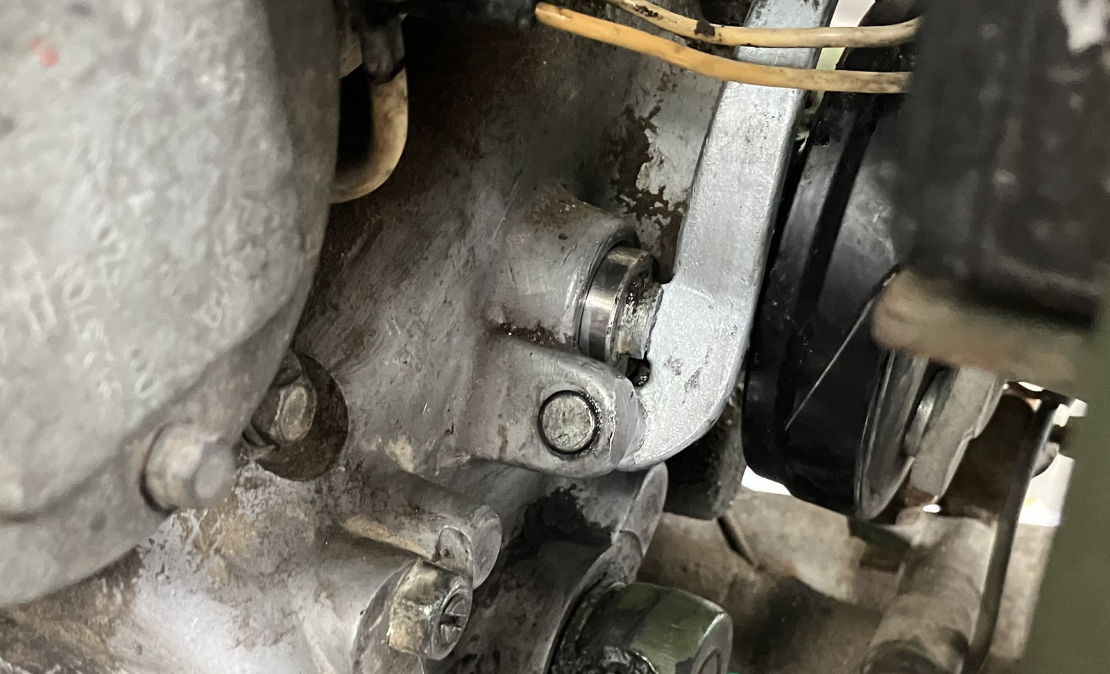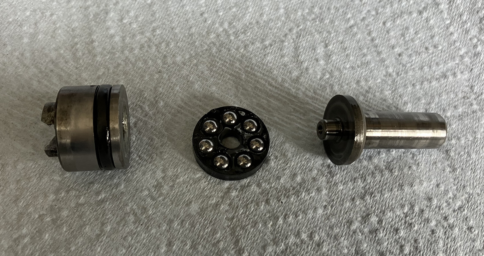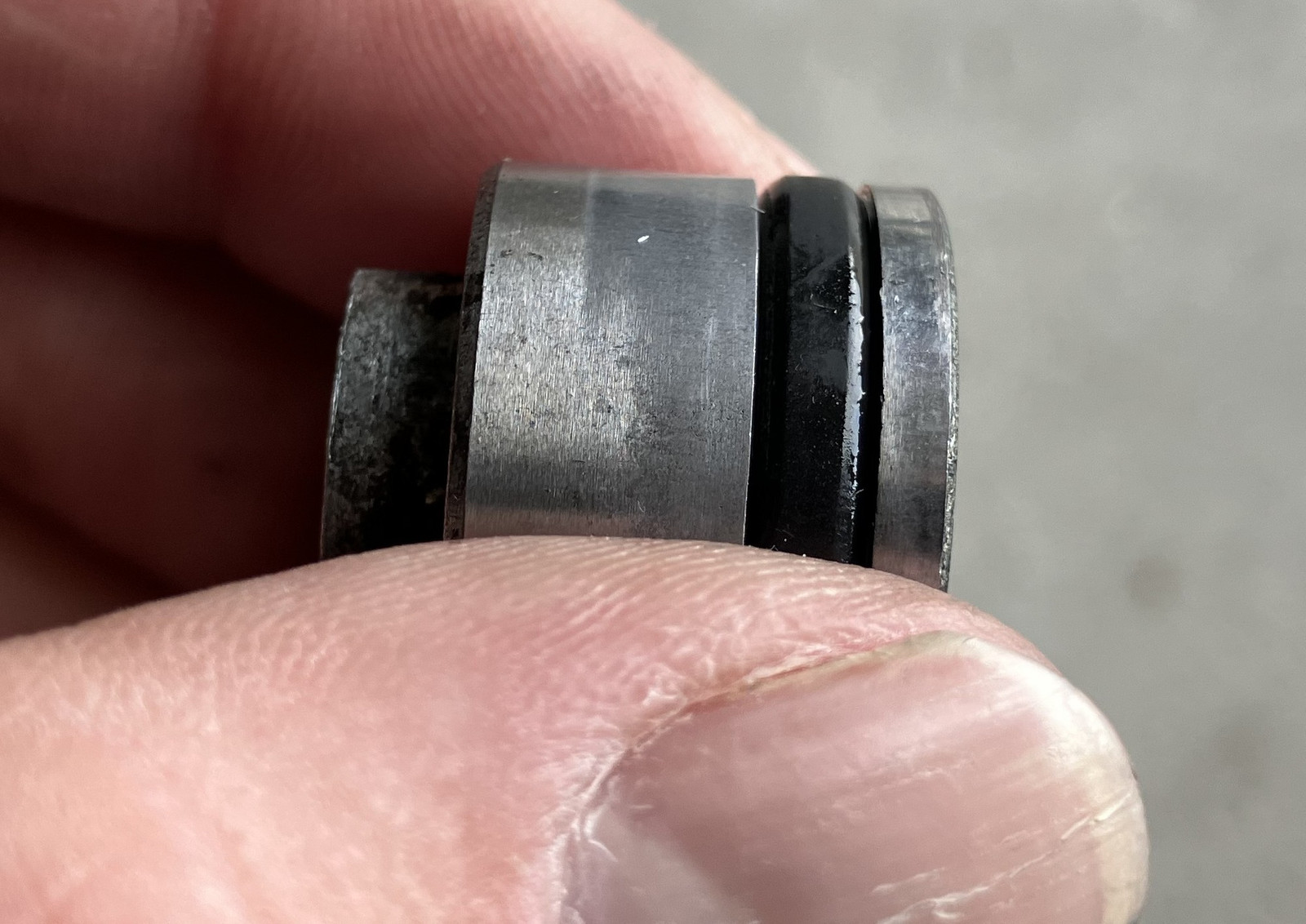If you were to be small enough to shove your head back behind the engine, or had the engine out on a stand, you would now see the problem (potentially): Ball bearings being used as thrust bearings with flat surfaces. There’s (ideally) still a plastic retainer holding them, and mine appears to be in good shape. If you don’t see this, you’ve got a newer bearing style and are fine, just replace the O-ring and go. But if you do see this, you’ll want to find something better. But how, on earth, do you get something like this out? If the gearbox is out of the bike, push on the rod in front and you’ll push this out. But taking the gearbox off is a pain. Also, it’s not needed!