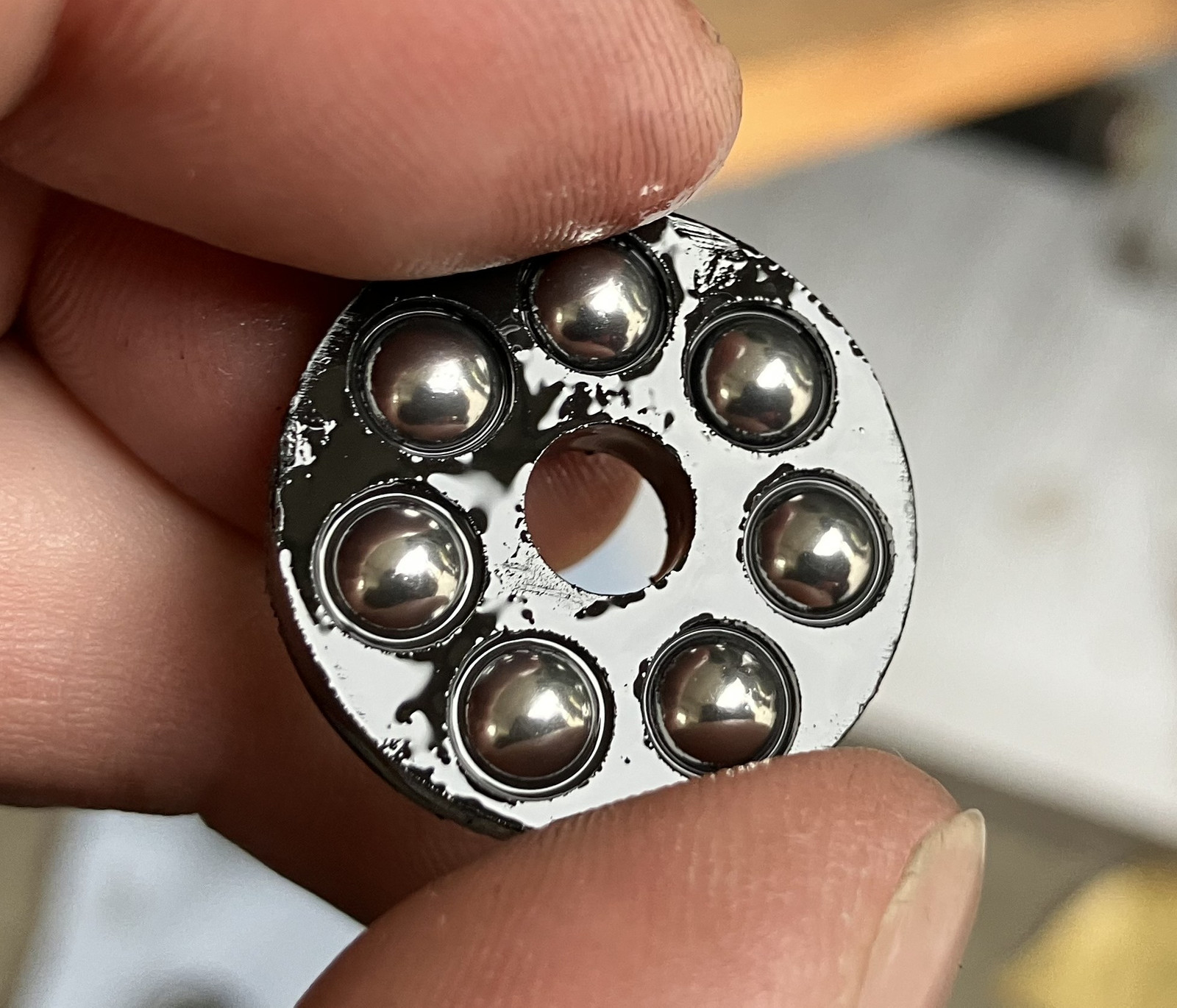 The good news is that there’s no obvious damage to the bearings or their holder. They’ve clearly been clattering along a section and unevenly loaded, but nothing seems to be terribly wrong with the existing bearings - other than being the wrong bearing for the job.