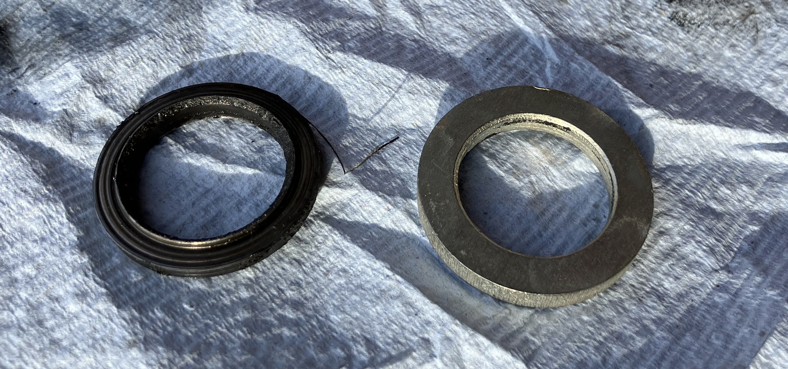 Earlier, I mentioned the sidecar wheel spacer that goes between the wheel and the hub. Especially if the sidecar wheel nut isn’t kept tight, these are prone to wear (though they may still wear with the nut tight - I’m not really sure what causes it other than “they do this”). I replaced mine, and again, I didn’t realize just how worn the old one had gotten. The new one is on the right, old one on the left, and the wear is evident.