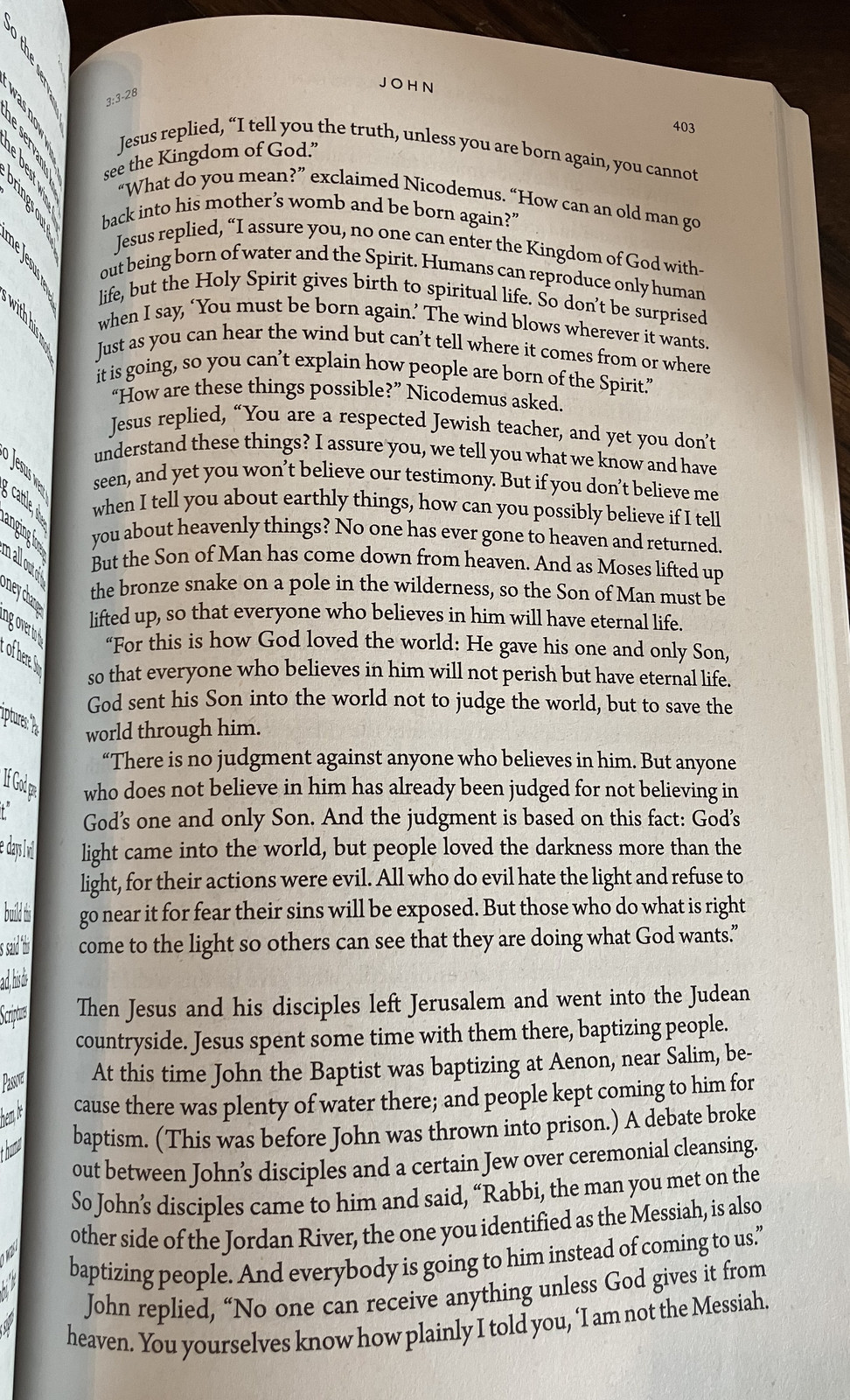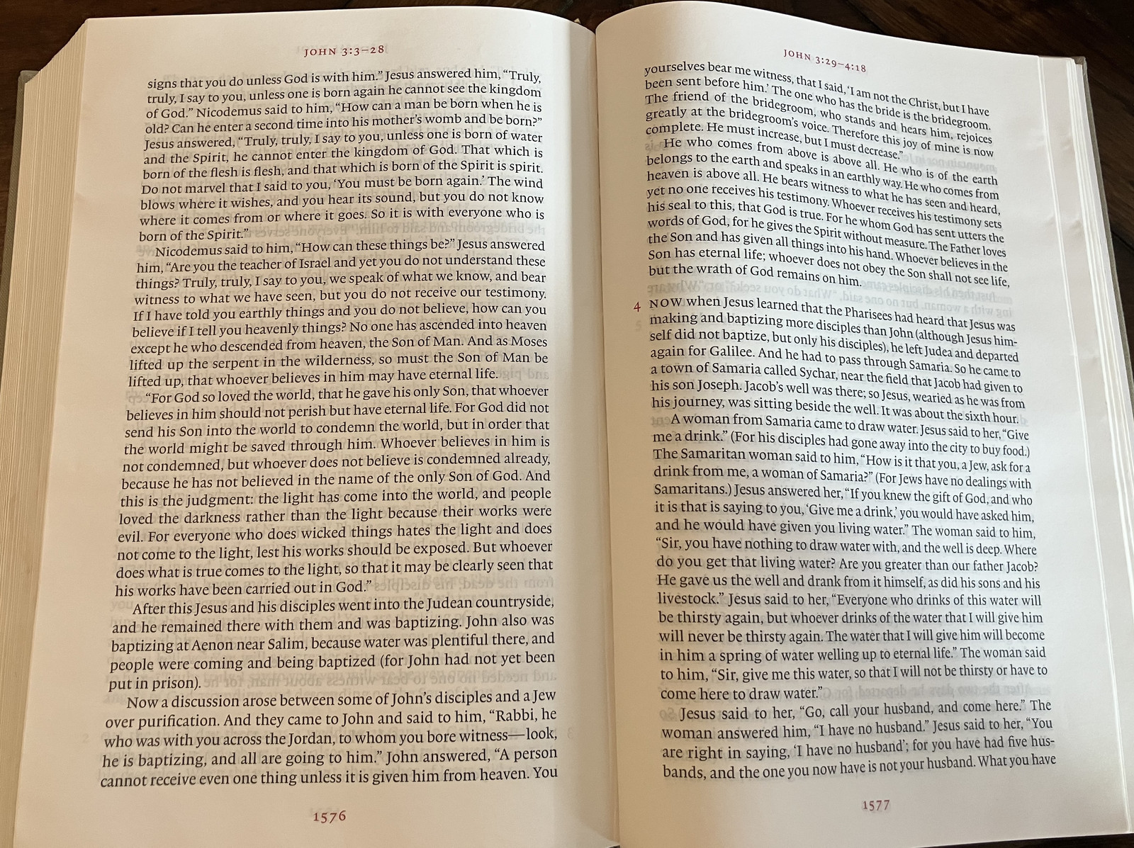 Inside, the books just read like, well, a book. If you are familiar with Bibles, you’ll notice that verse markings, chapter markings, footnotes, and all the other distractions are simply missing. All you have, as a guide, is a subtle marker at the top of the page showing you which verses are on the page. That’s it!