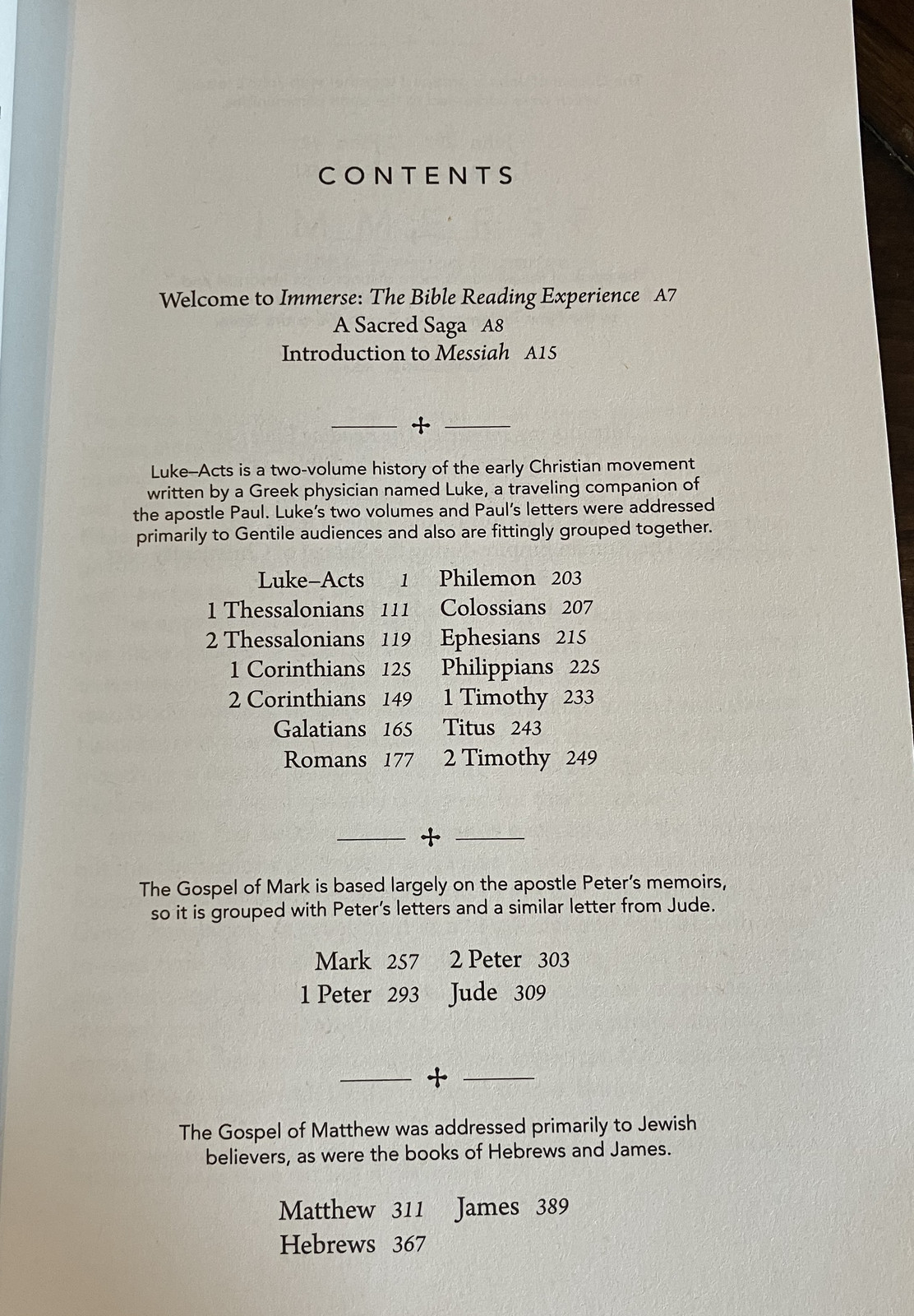 But the differences go beyond just the page formatting, and into the actual ordering of books. Quite a few of the books in the (standard Christian) Bible weren’t actually separate books - they were split up for convenience when dealing with scrolls. Immerse puts all this back together. In their layout of the New Testament, Acts follows Luke (as Luke-Acts), and Paul’s writings are generally chronological, not “longest to shortest” (mostly). In the Old Testament, 1-2 Samuel and 1-2 Kings are combined together into Samuel-Kings as they were written. Their concept is simply to remove the artificial separations and distinctions (there are plenty of chapter breaks in the middle of thoughts) and present the text as it was originally intended - as a continuous writing, for continuous reading.