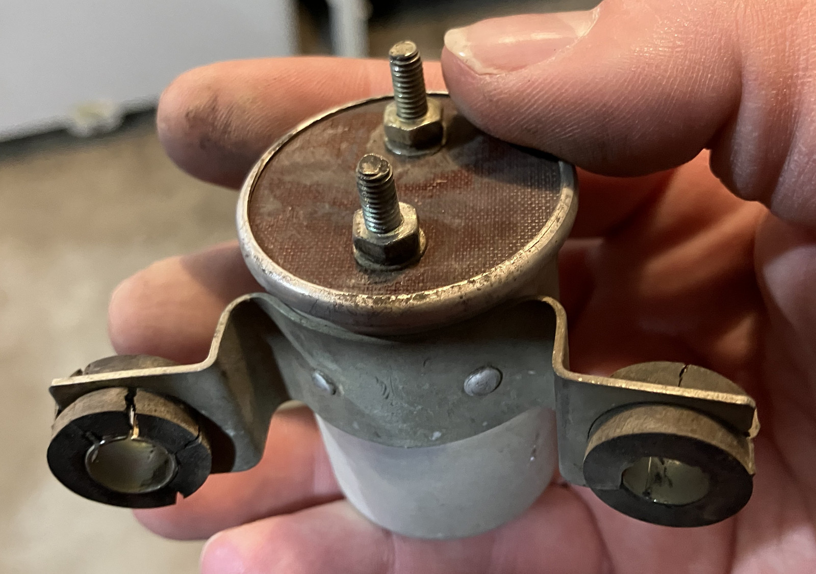 Removed, it should look about like this. Two rubber bushings with metal inserts, probably age-cracked (the rubber here is most of 20 years old), and two terminals. This is the flasher module! If you’re bored, and want to pull the thing apart to see if you can fix it, it’s assembled with nothing but the metal being bent around the mounting plate on the end. A small set of channel lock pliers will do a fine job of opening this up to reveal the guts.