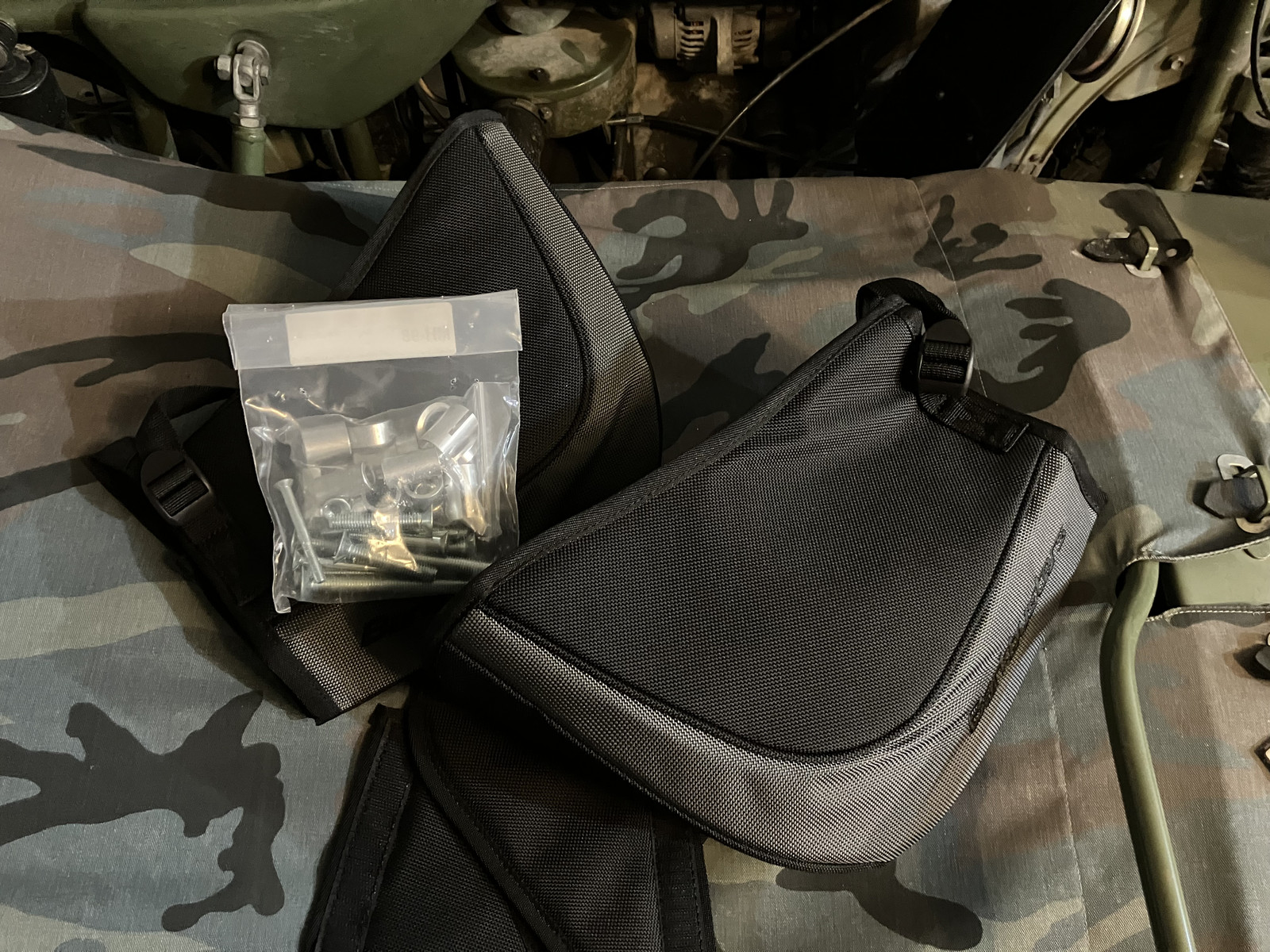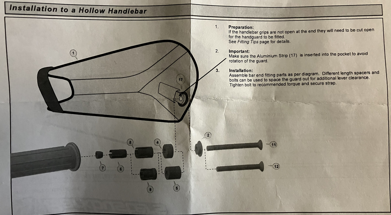 The kit comes with two fairly massive handguards, some velcro triangles that help seal the inner corners, and a pile of hardware used to install them. They don’t really come with “Installation Directions.” They come with “Installation Suggestions, apply to your bike as seems appropriate, or do something else that works.”