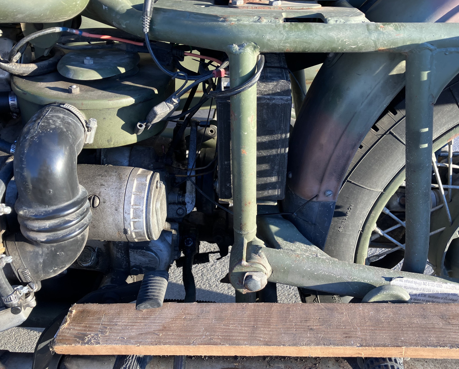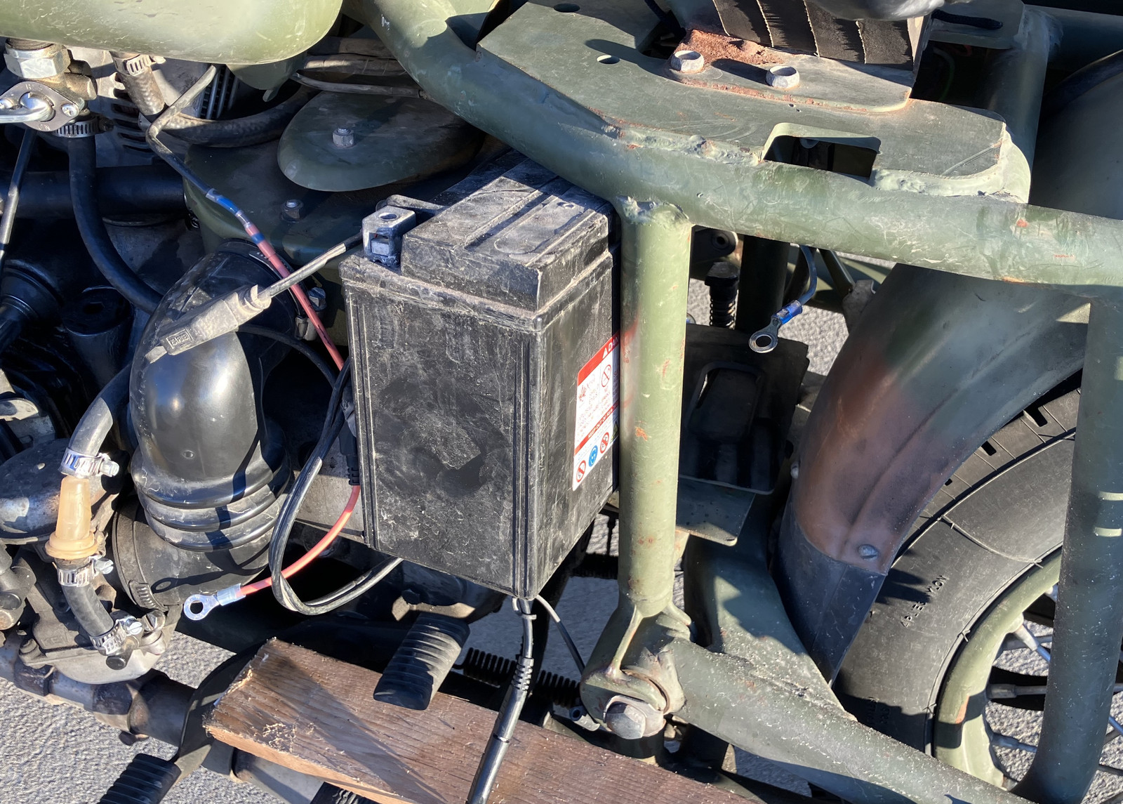The battery on a Ural is under the side cover, directly below the seat. Newer Urals have a handy-dandy screw in plate for the seat to mount to. My seat plate is welded, so I can’t go out the top. Not that I need to. Seriously, the batteries aren’t bad. The important step is to pin the kickstart lever down, somehow. Here, I’m using a piece of lumber I had laying around, wedged under the shifter. I’ve used bungee cords too, and a zip tie would work fine. Just pin the lever all the way down, and the rest is straightforward.