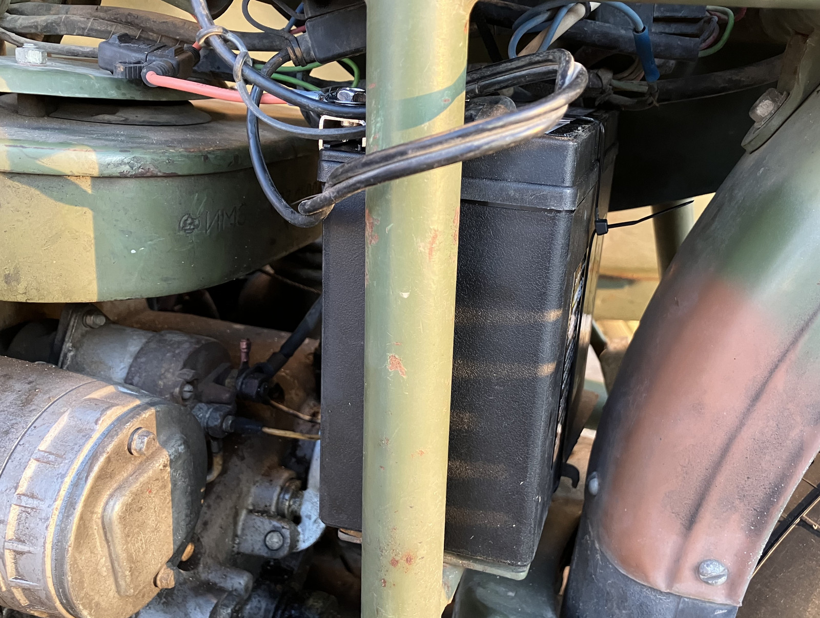 Back in, my suggestion is to then zip tie the battery down. I don’t know if there were other hold downs at some point, but a tight set of zip ties does a good job of keeping the battery from wandering around if you’re doing stupid stuff off-road.
