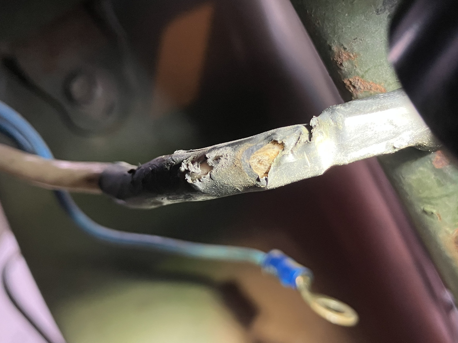 The insulation where it was rubbing did not look encouraging, so I taped it up with some electrical tape and went on my way without sparks! At least, for a day or two. Then the fireworks came back… so further into the ground system I go.