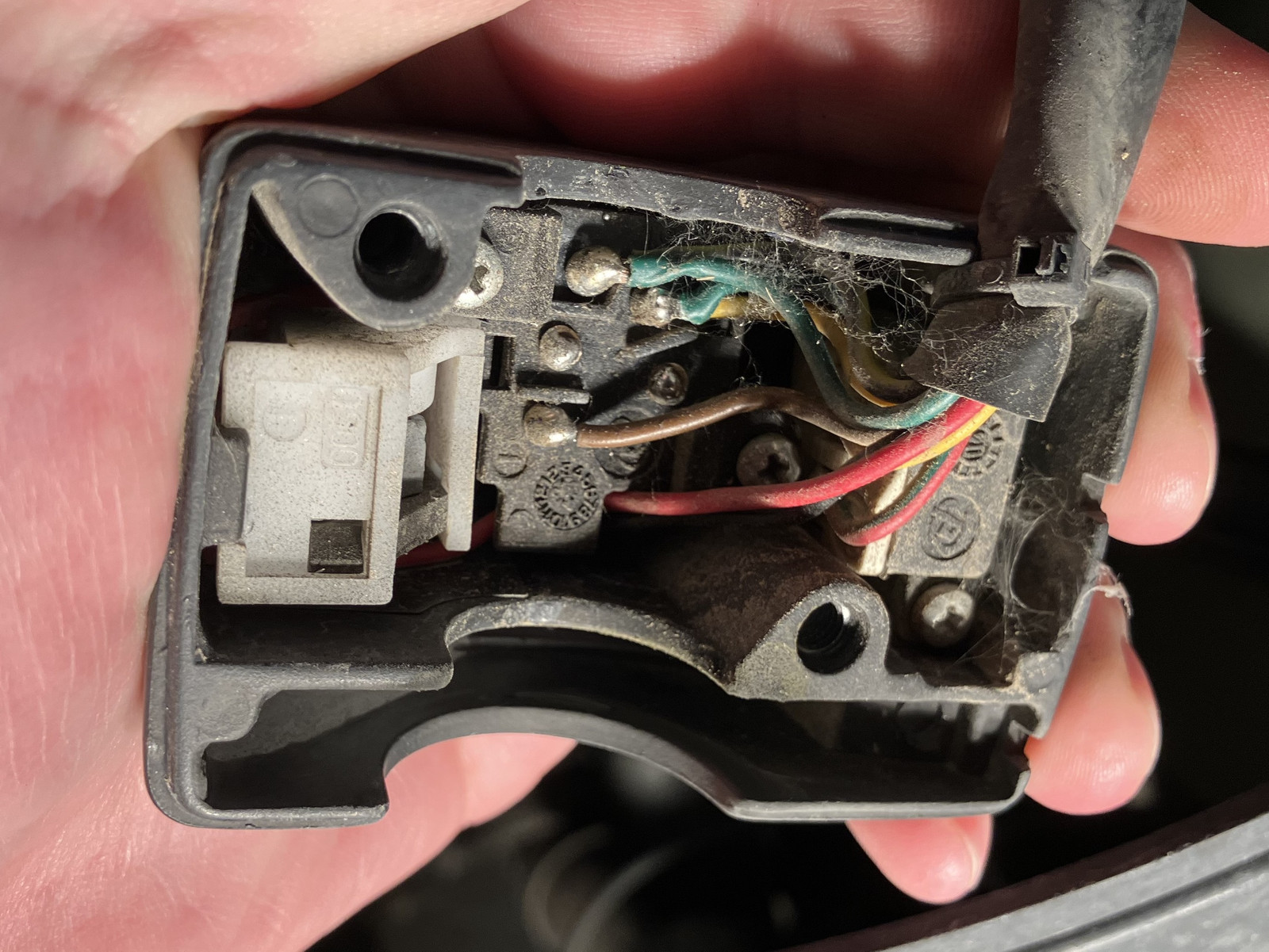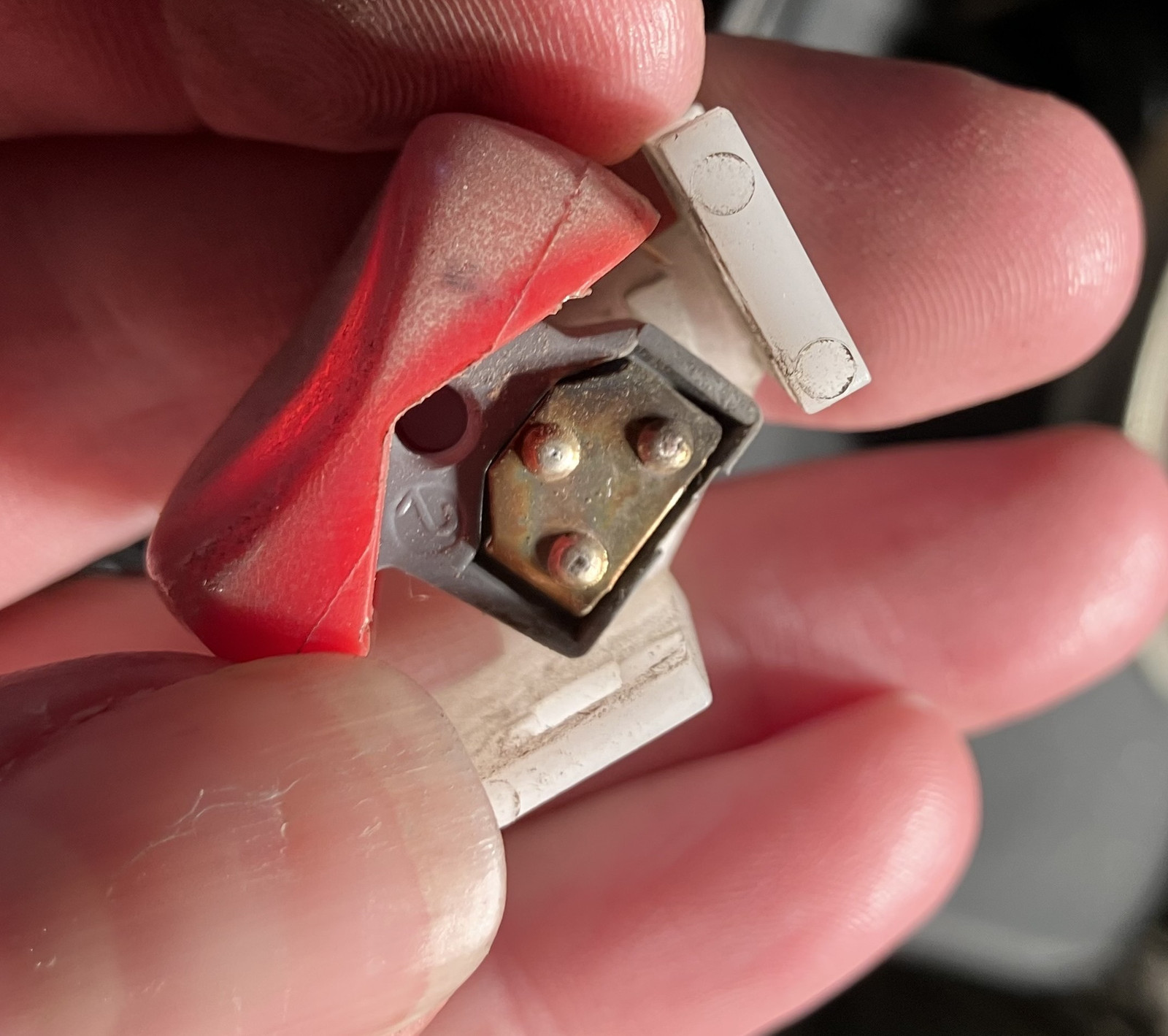 Pull the visible screws out and the switch comes apart. There are a bunch of unused contacts in the center section, and the goal of my project - the two wires leading to the run/kill switch. It’s several plastic pieces that simply pull (carefully… it is 20 years old!) apart to reveal the switch contacts.