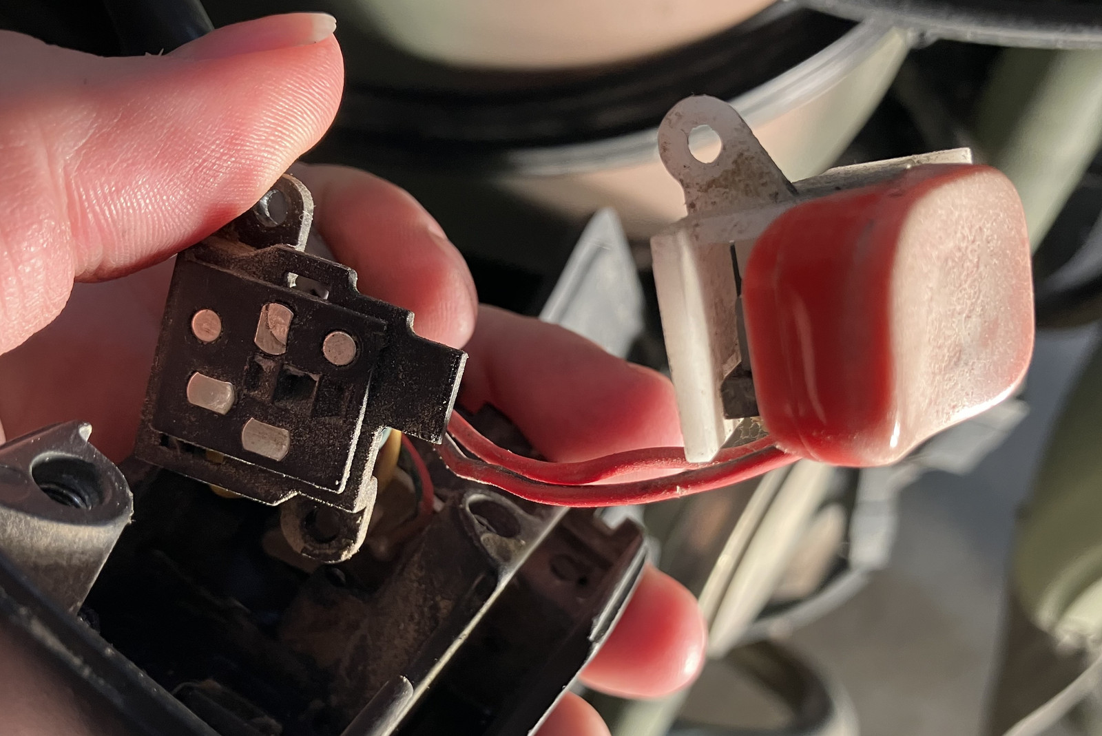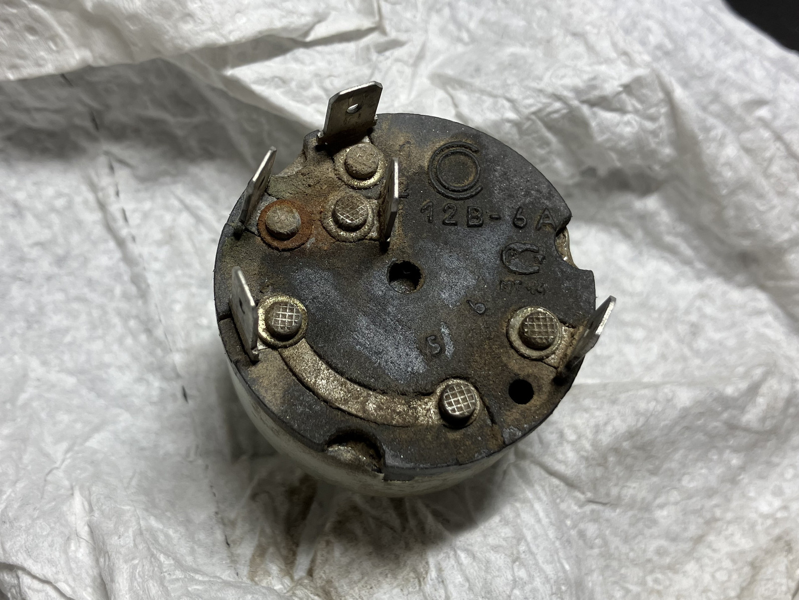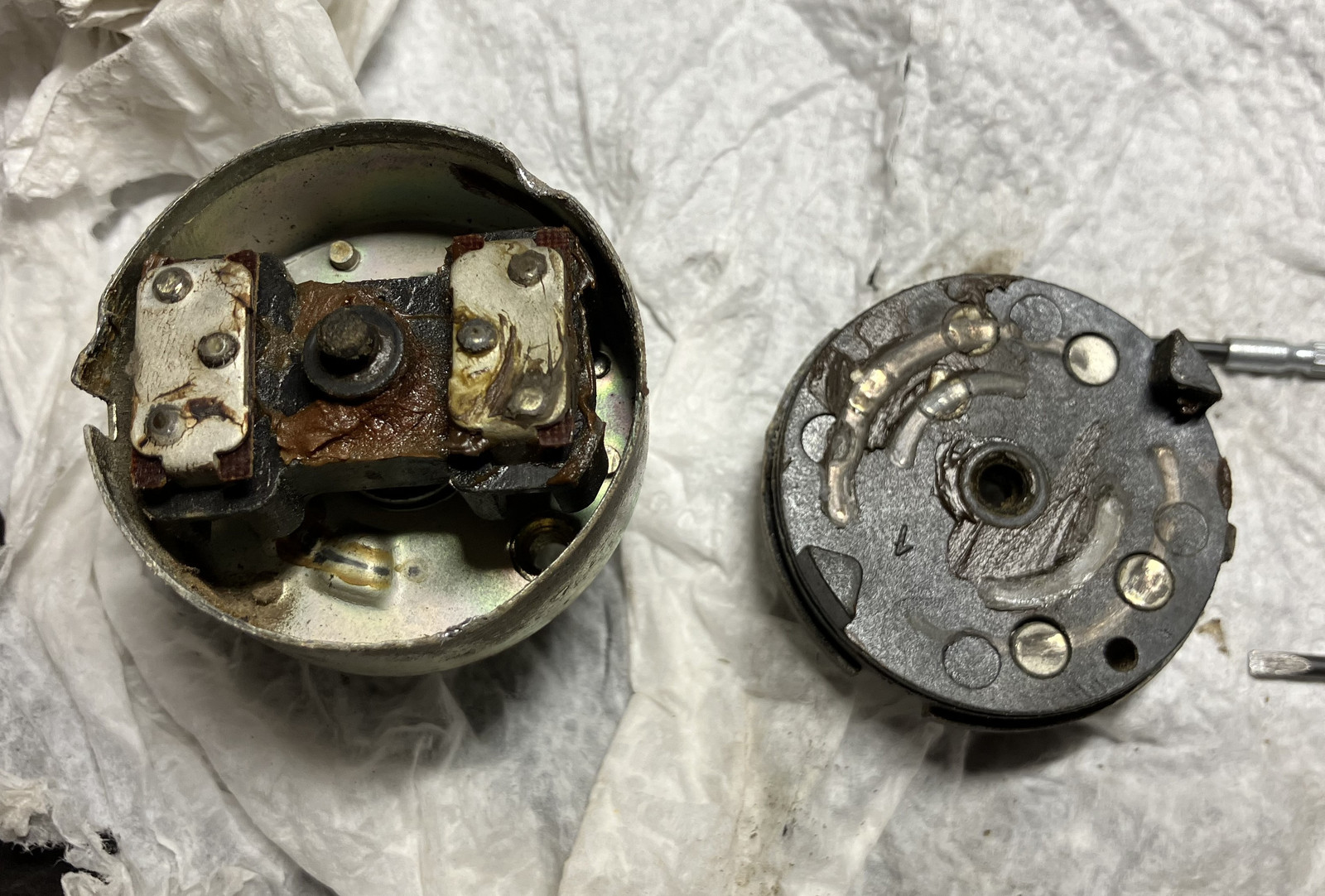 The other half is a metallic set of contacts that slide around. It’s not incredibly obvious in the photo, but the top section here is a bit blackened, implying that there’s probably been some arcing in here over the years. Or at least heat. Nothing seems particularly damaged, but I’d rather see a nice shiny set of contacts. The resolution is simple: Clean these up, apply CorrosionX to bond to the metal and protect it, and reassemble the switch. You could probably put some diaelectric grease (“tune-up grease”) in here if you wanted, but the switch gear was dry when I pulled it open, so I’m inclined to leave it mostly that way.