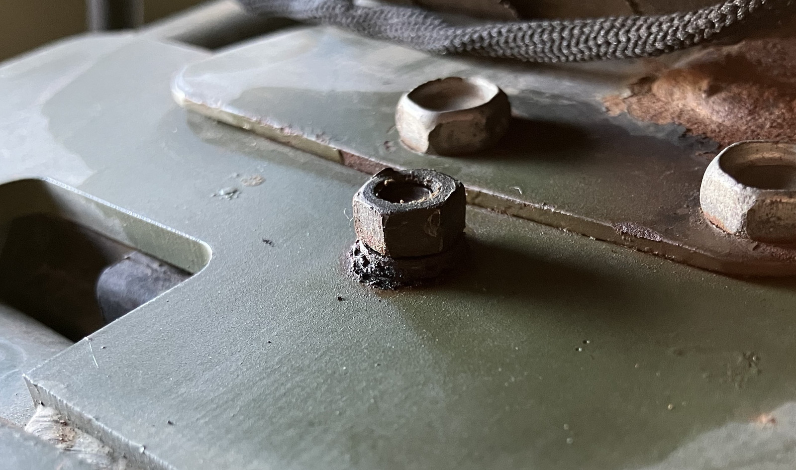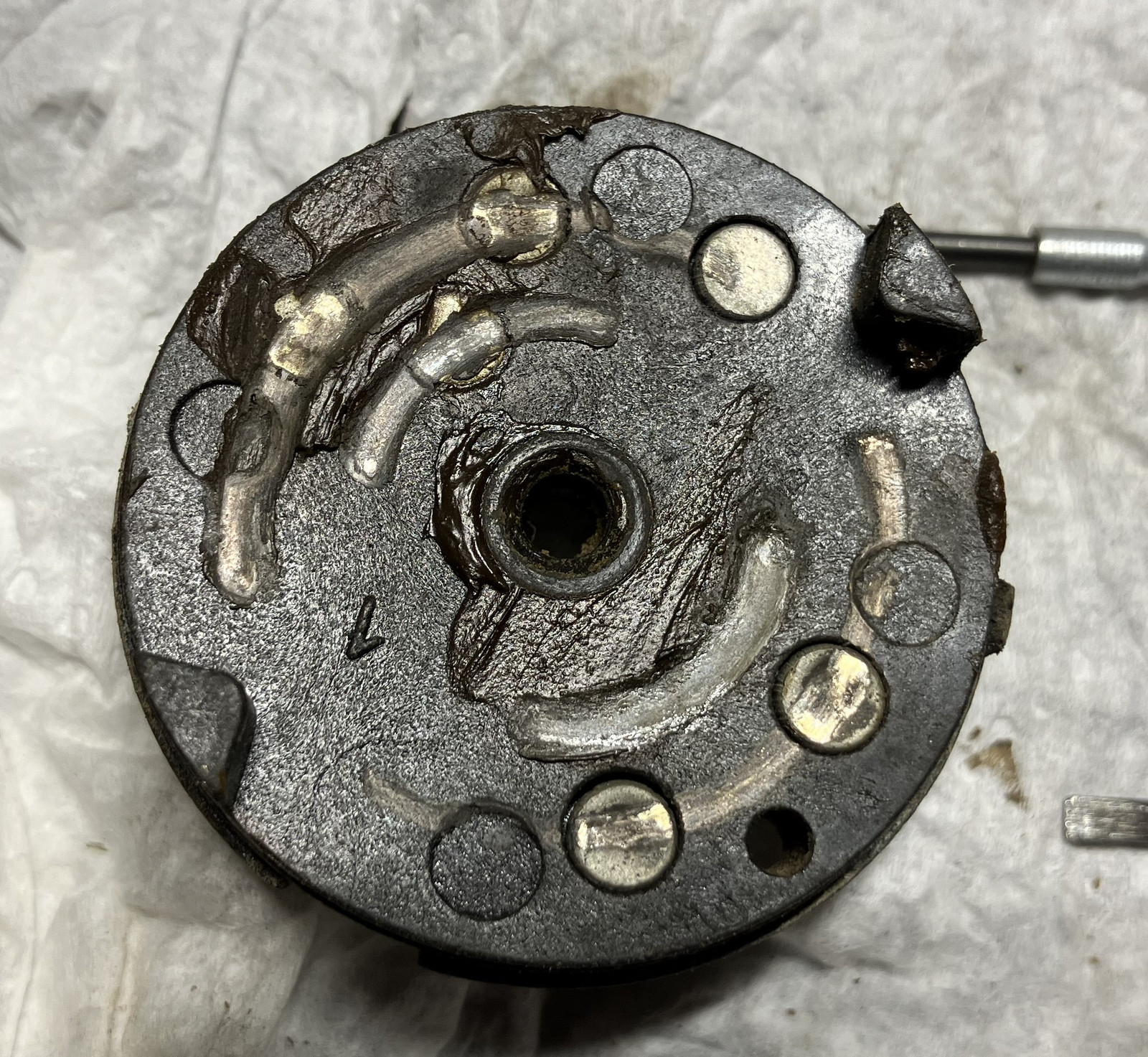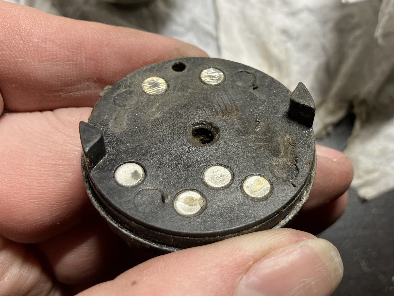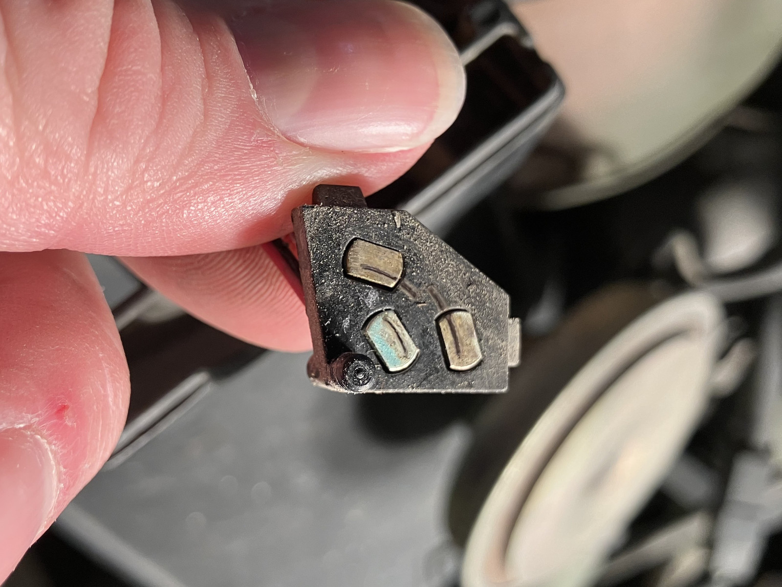 The contact plate is greased, and shows signs of assorted “crud buildup.” Is this arcing? Is this age? Don’t know. Don’t care! I’m going to clean it up, re-grease it, and see how things work!