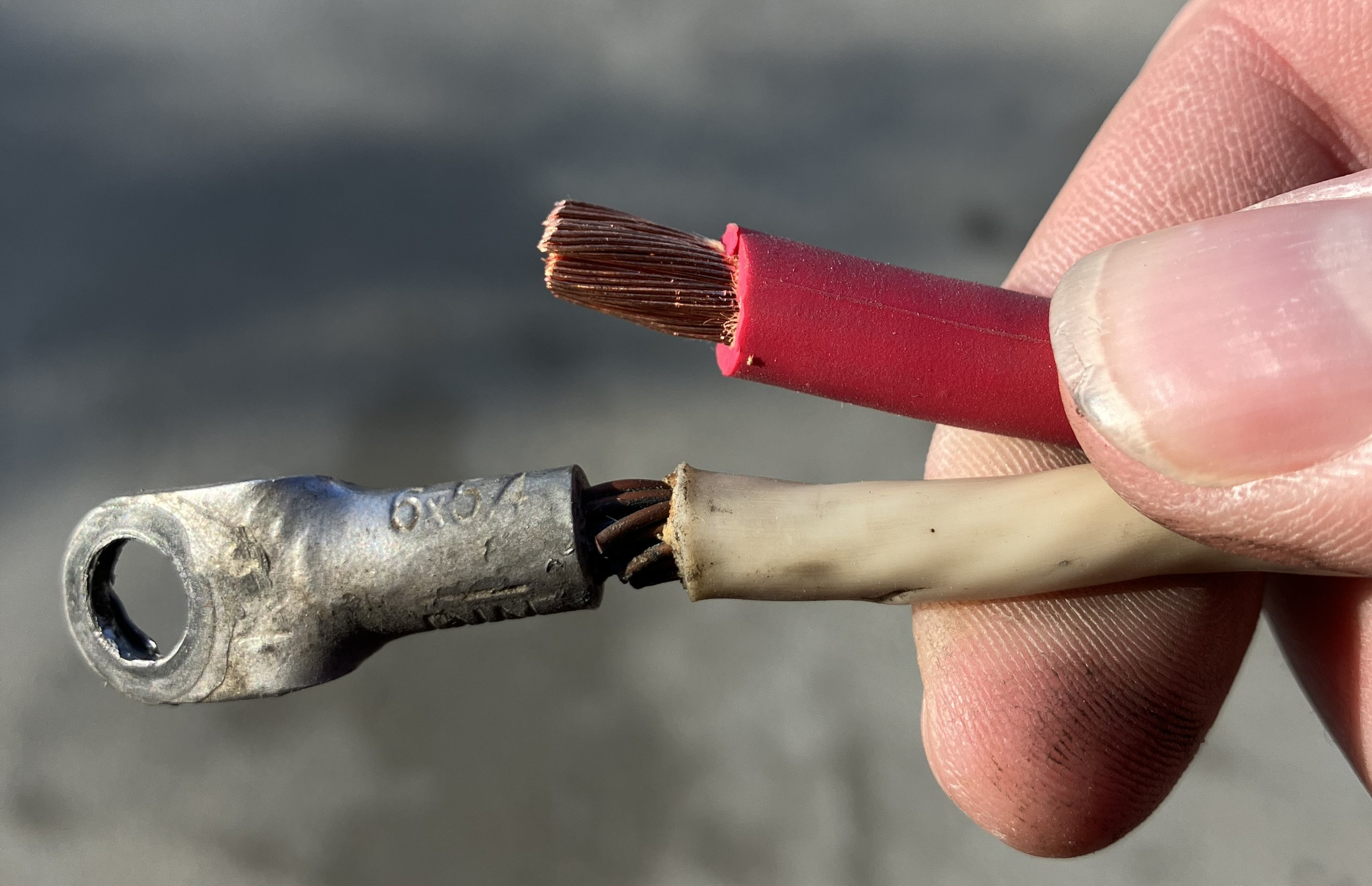 For reasons best described as “Because it was what they had close,” I ended up with some 6AWG welding cable with red insulation. The stock wire is 8AWG, but I’ve never been one to starve a ground wire, size-wise. I wanted welding cable, because it’s far more flexible - you can see the massive difference in strand size and count between the two. Welding wire is less likely to break in operation, though it is somewhat more prone to corrosion, with the increased surface area. Given that I’ve got what looks a lot like vibration induced failure in the old wire, I may as well fix that problem. As for 6AWG vs 8AWG? It doesn’t matter, but you won’t make things worse with a larger ground wire. I’m not saying you need the 4/0 neon blue ring rounding system, but… grounding issues are a bloody nightmare to troubleshoot. If you’re dealing with the system, fix it once and for all.