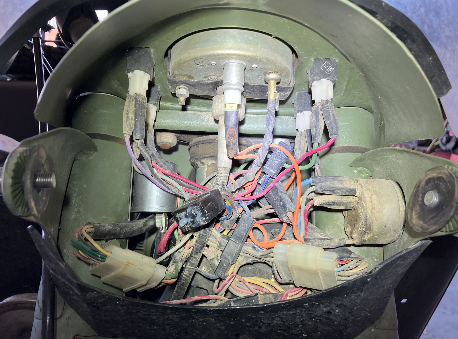 Step one of working on the ignition switch is to get access to it. Remove the headlight bucket with the two bolts on either side, disconnect a connector (familiar to me from Part 2), and you can see the switch over there on the right. Now is a good time to clean out your headlight bucket. It’s likely to be a dusty mess.