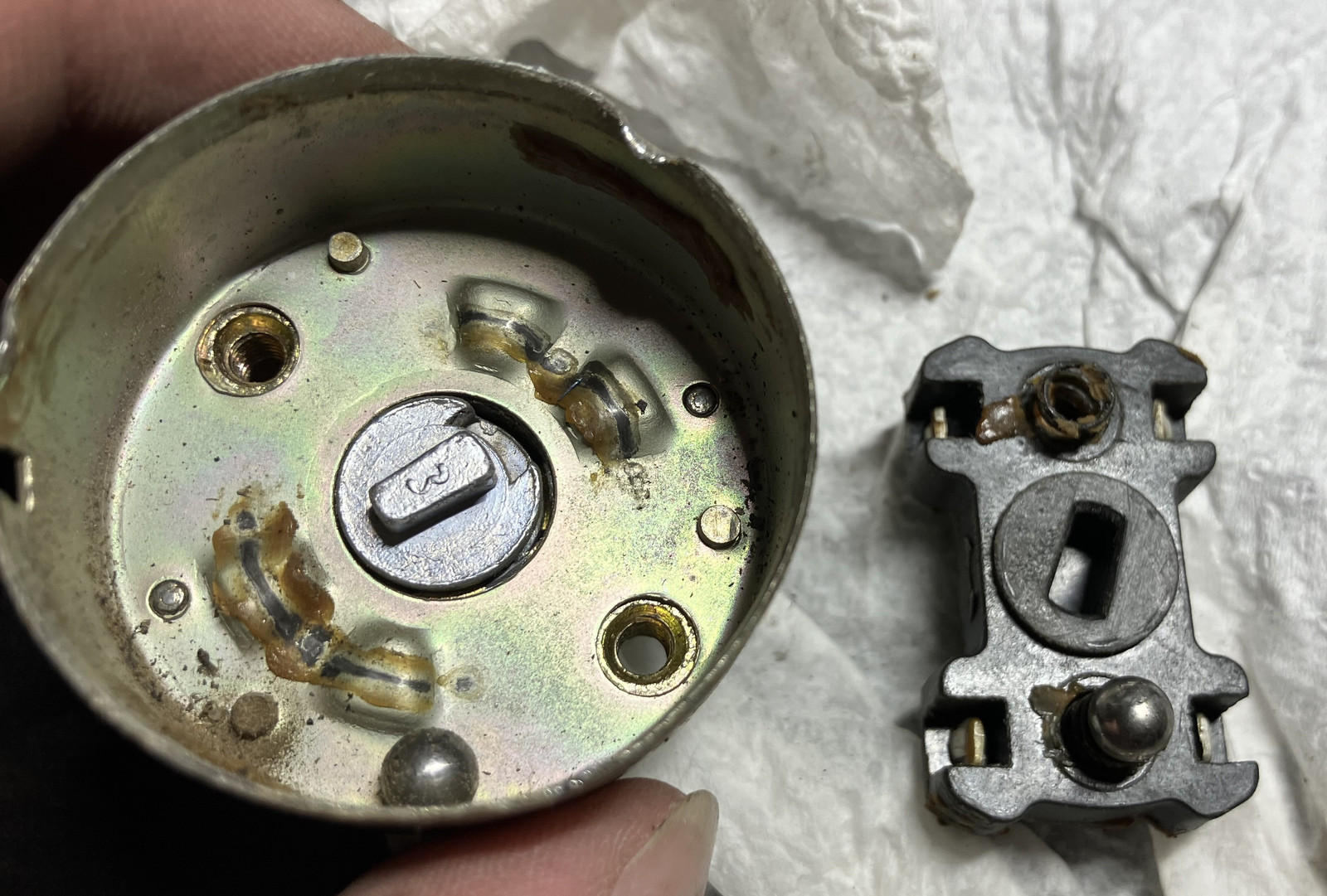 The contact side has three contacts. Only two are connected to anything, but they’re showing some signs of corrosion (that green-blue stuff is a dead giveaway that this has gotten wet at various points), and it could use cleaning. You can see the arc the contacts trace as the switch moves - I would guess on some motorcycles, this makes a connection to power the ignition circuit, and on others, it grounds out the ignition coil when it’s turned to the “kill” position. I’ll be honest, I’d rather not have ignition coil voltage anywhere near my hands.