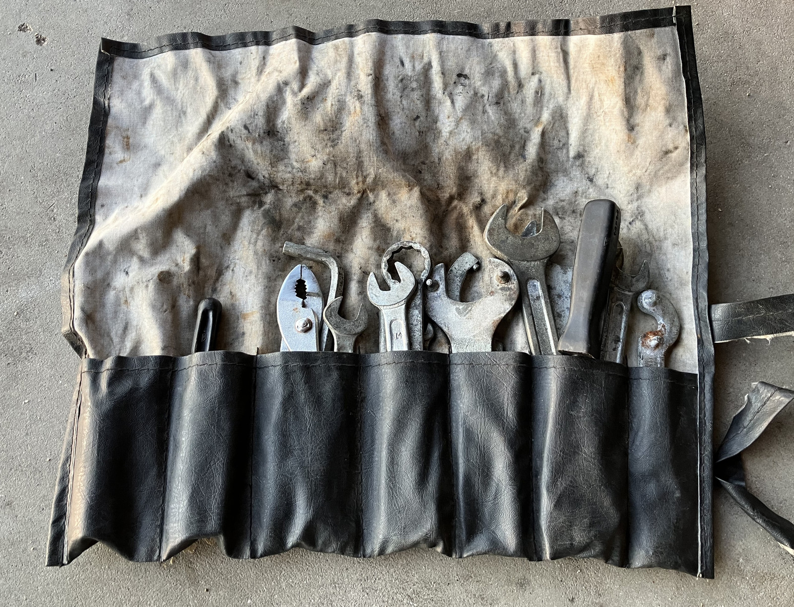 My 2005 comes with this fairly complete kit in a leather roll. Pin wrenches for the wheels (that also work on the spare tire nut), an assortment of wrenches (bolt heads and nuts are different sizes on Urals so you can use the provided wrenches properly), some pliers, a couple screwdrivers… it’s got a solid kit that, for some while, was the unofficial church toolkit.