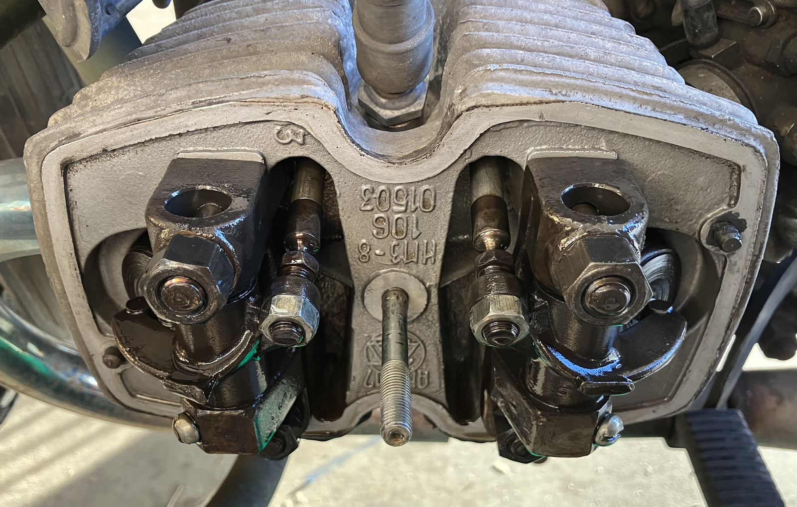 The camshaft is in the center of the engine case, and pushes on the (rather appropriately named) pushrods - the rods extending down into the center of the head, and through passages to the engine case. And once again, if you’ve not read about the lunatic doing an Iron Butt rally on a Ural, you should really read it. “Find metal, make pushrod!” These, as they’re pushed, lift the rockers (the curved pivoty-looking things), which press down on the valves (on the outside). Setting the valve clearances involves adjusting things so the valves will always fully close (a valve hanging open will leak, but, worse, won’t cool properly and will fail in a hurry as a “burned valve”) - but aren’t looser than needed, because if they’re too loose, there’s a lot of banging going on in the valvetrain, and the valves aren’t opening as far as they should be.