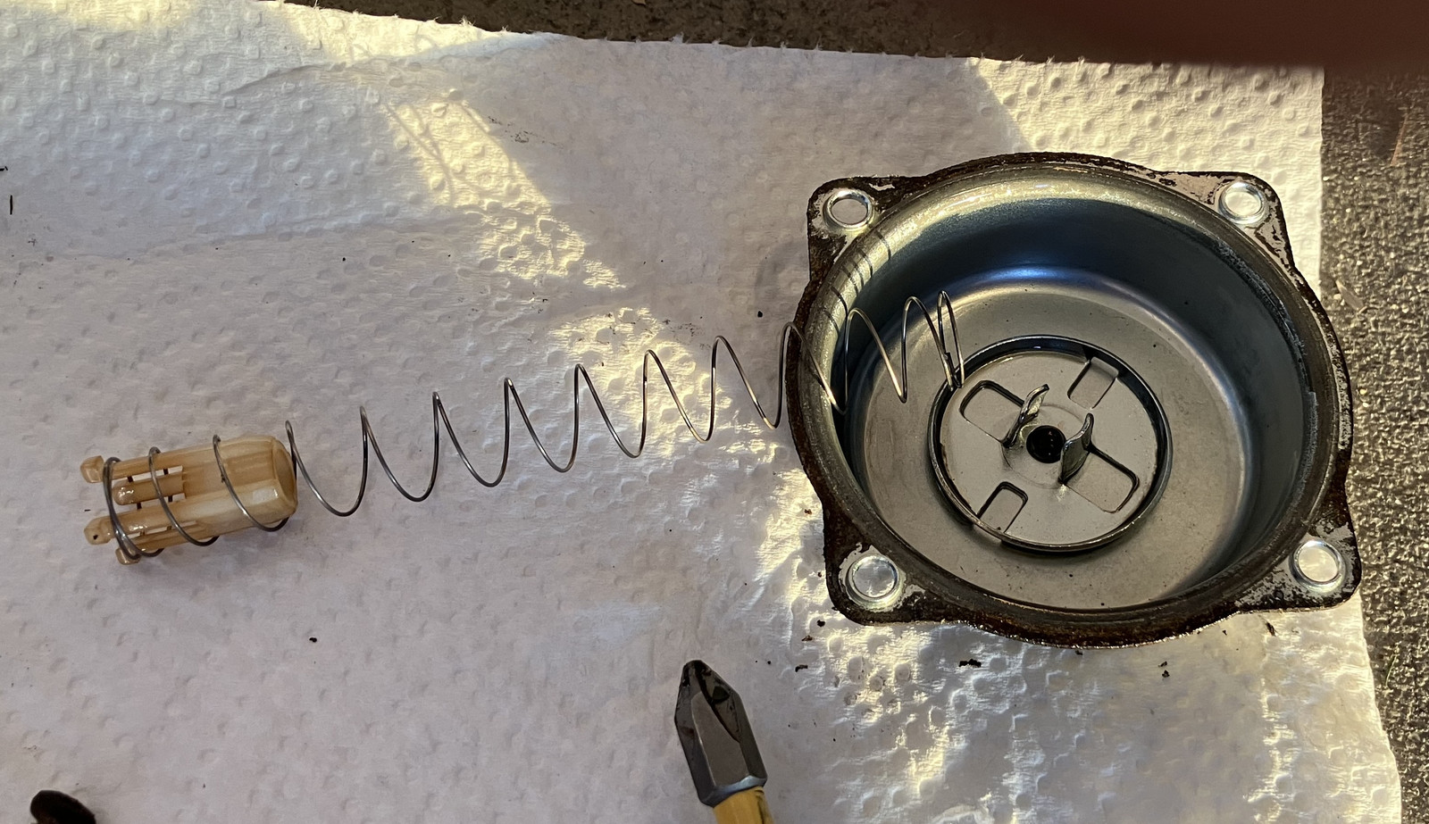 As the last screw comes loose, the top of the carburetor will start to rise. There’s a spring in there. Make sure things don’t go flying around - the spring isn’t terribly strong, but it’s enough to be aware of. Vacuum from airflow fights against this spring to keep airflow roughly constant through the main metering opening.