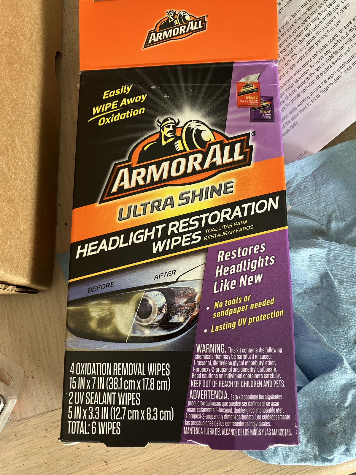But also, since I have a replacement, there’s absolutely nothing but a few bucks to be lost experimenting with the previous one. I’ve known about the “headlight restore” kits for some while, though I’ve never had to use one as most of my headlights are glass, as they should be, not some funky plastic that turns yellow with age. But, also, there are no shortage of kits to help with that problem. For no particular reason beyond “It seemed like it would work, and didn’t involve drill polishing tools,” I grabbed this kit from my local parts store for about $12.