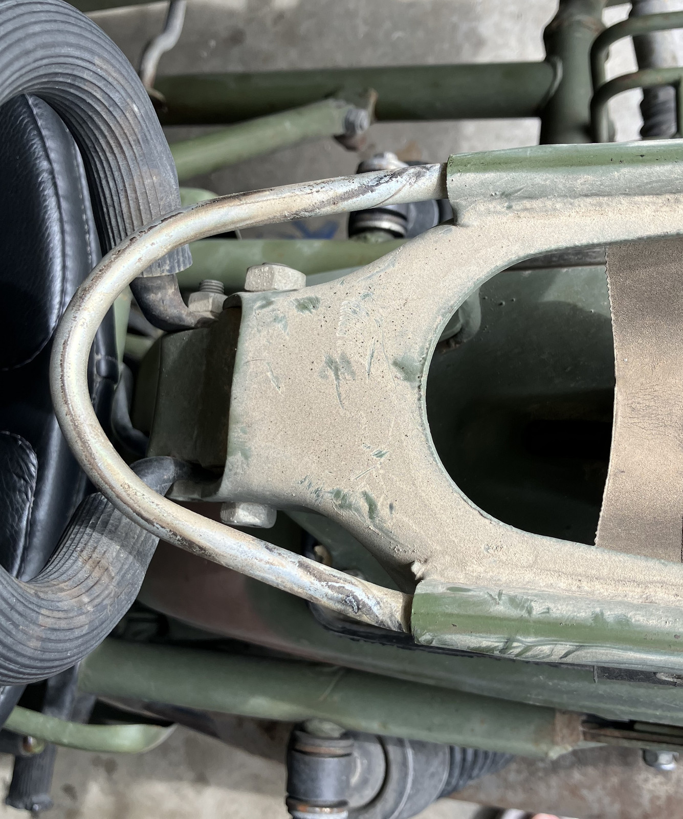 However, if you want to disassemble your seat, the trick is that the rear support bar slips into the rear supports about like this. The whole thing pulls “up and to the rear,” and comes free. If your old seat is trashed, cutting it off is probably the easiest option here.
