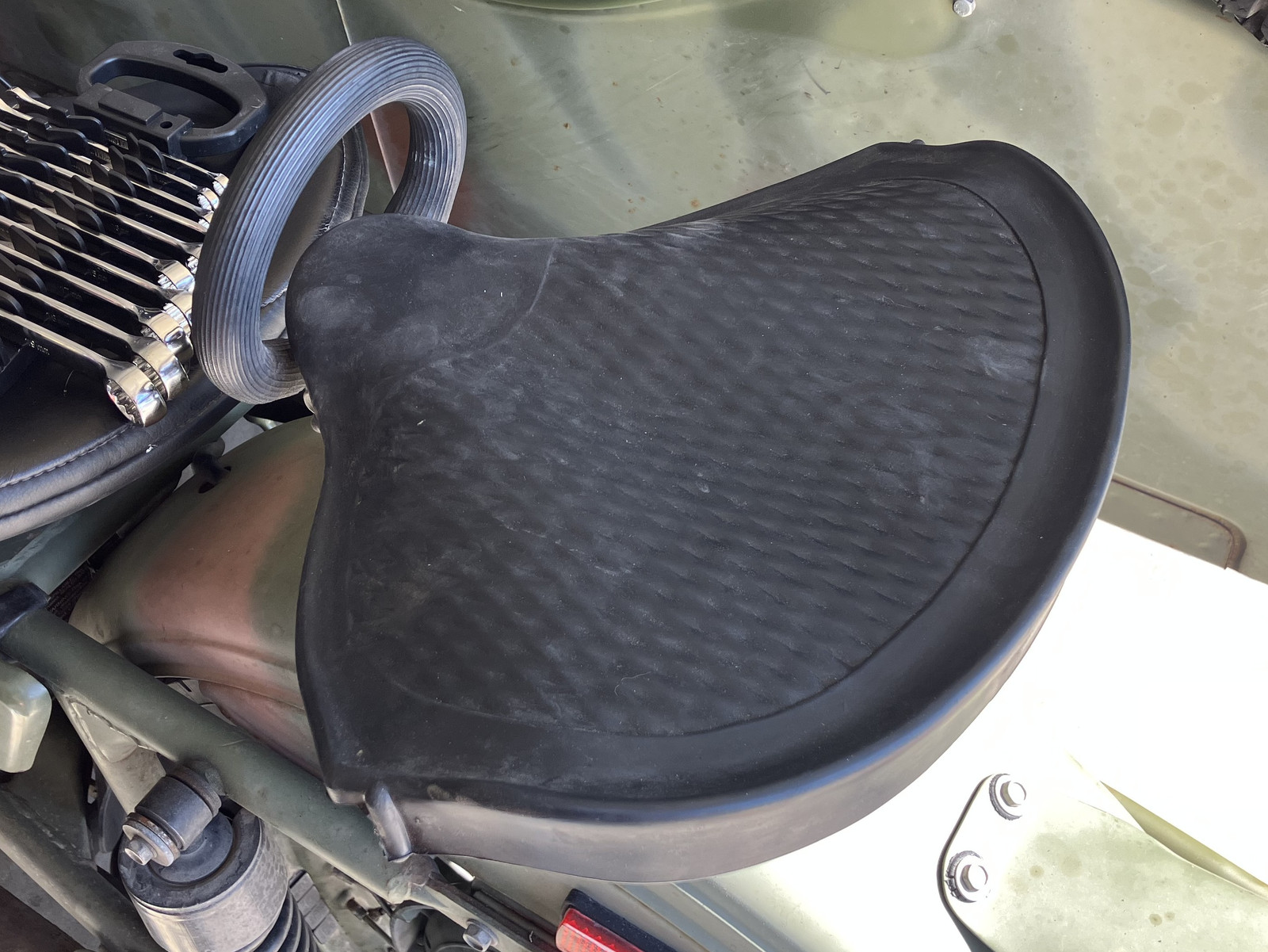 After discovering that my replacement rubber was entirely wrong, I went about the next best option, and purchased a new enough tractor seat from someone on Soviet Steeds (the remaining Ural forum). Remove the old mounts, and the new seat slips right on!