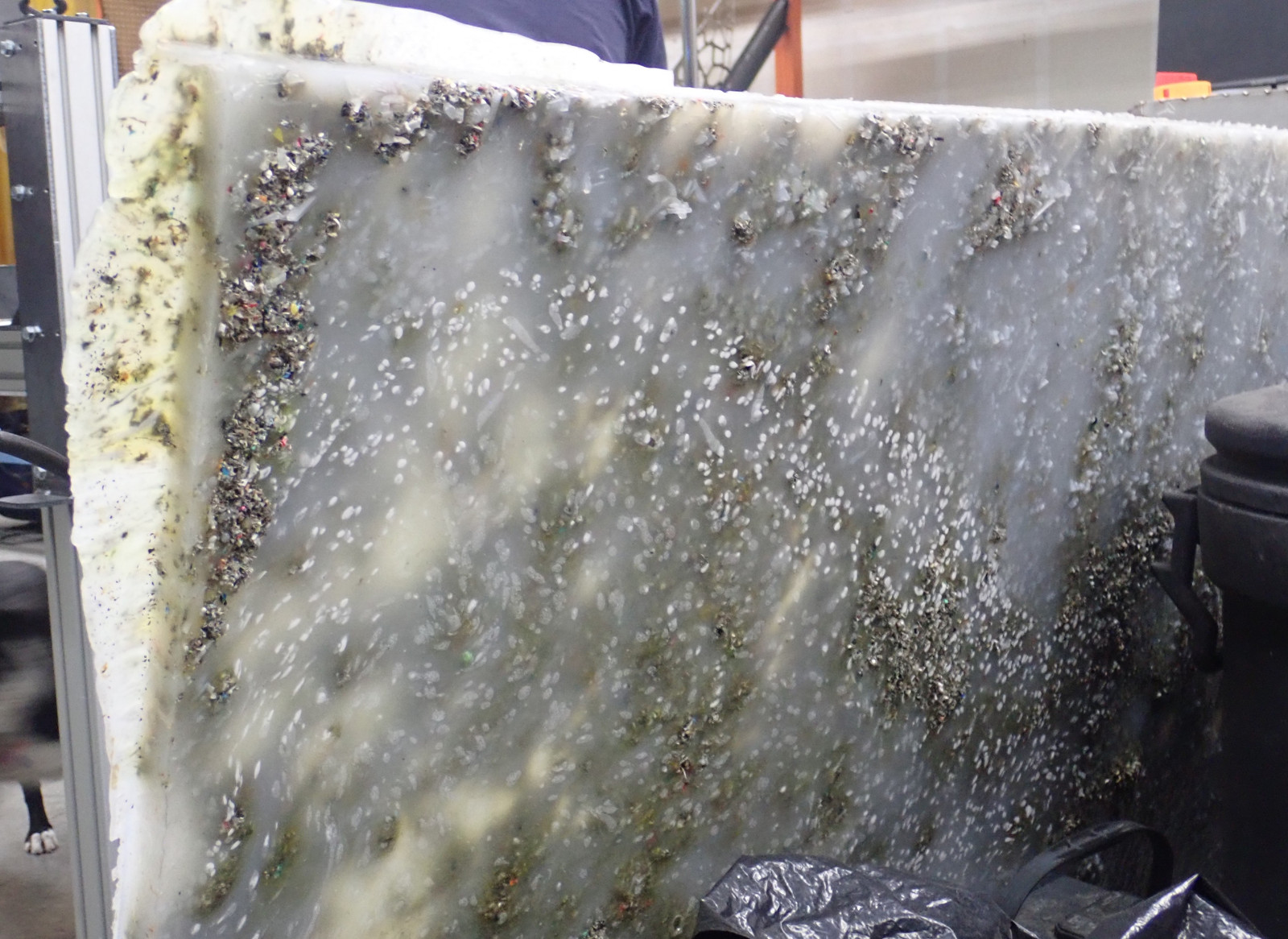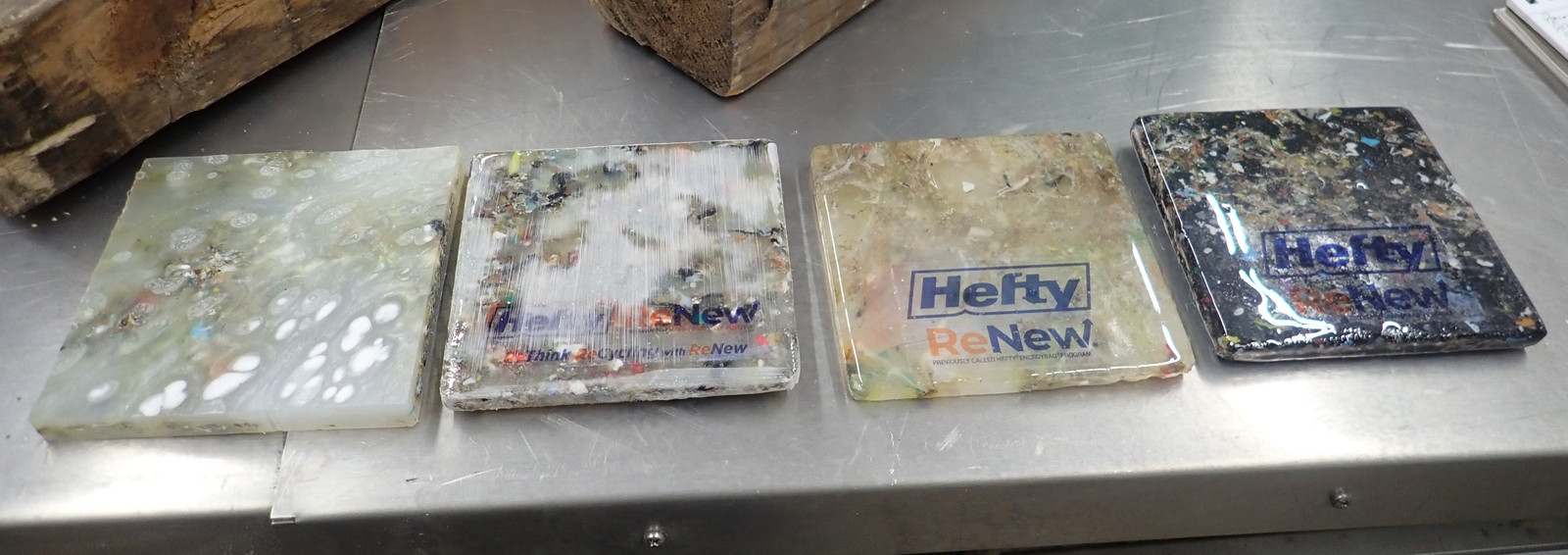 Apply heat, squeeze, and you end up with a sheet of plastic, showing the variety of materials that went into it. I was curious about the difference between thermosetting and thermoplastic plastics. Thermosetting plastics are the variety that gets hard when cured, and won’t re-soften - think epoxy that, once cured, won’t turn back into a liquid. Thermoplastics are the variety that get hard when cooled, but can re-soften when warmed up - think hot glue, where if you warm it up again, it turns back into a liquid. It turns out that in the normal mix of post-consumer plastic waste, there’s enough thermoplastic material to bond everything together. There’s plenty of thermosetting plastic, but it’s effectively an aggregate filler in the thermoplastic soup you get with heat.