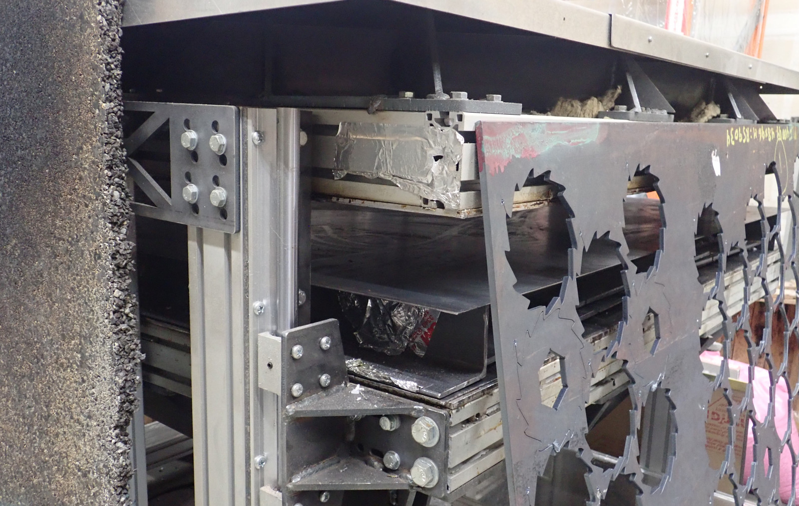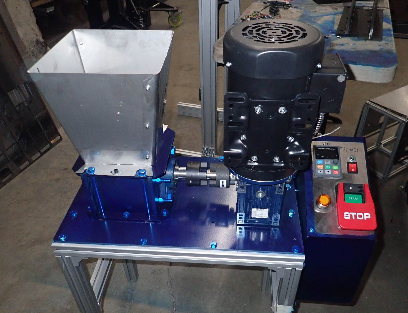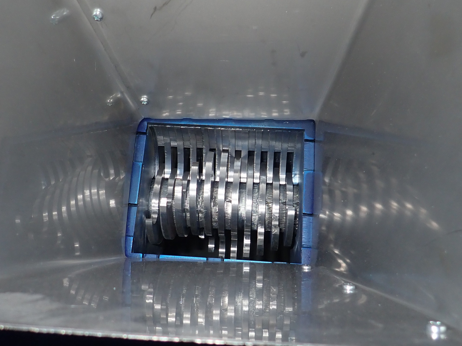 Outside, it’s a simple enough setup: Motor, gearbox, control panel with a very big stop button, and a coupler. If you’ve ever seen video of a large car shredder, hard drive shredder, or anything of the sort in operation, this is exactly the same, just smaller and R&D lab sized. Put a bin under it to catch the debris, which will be fairly well mixed coming out.