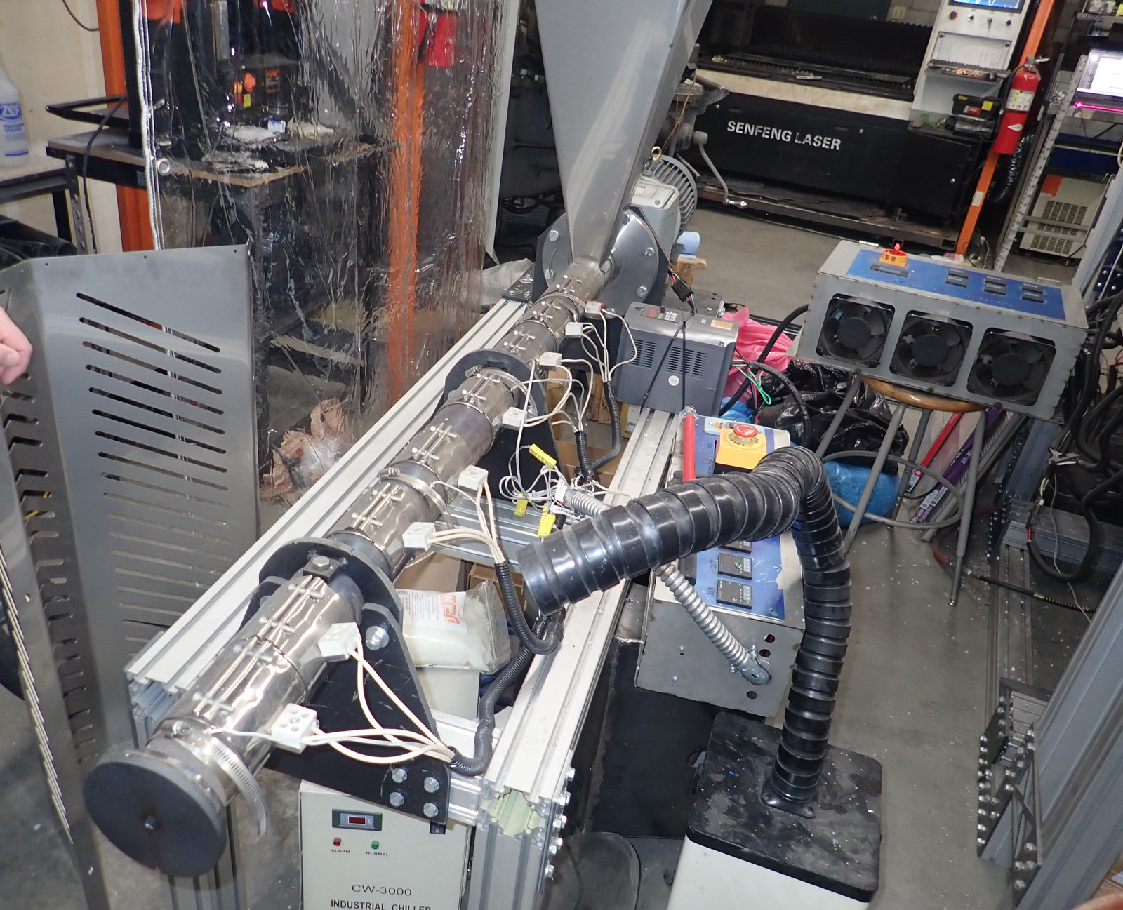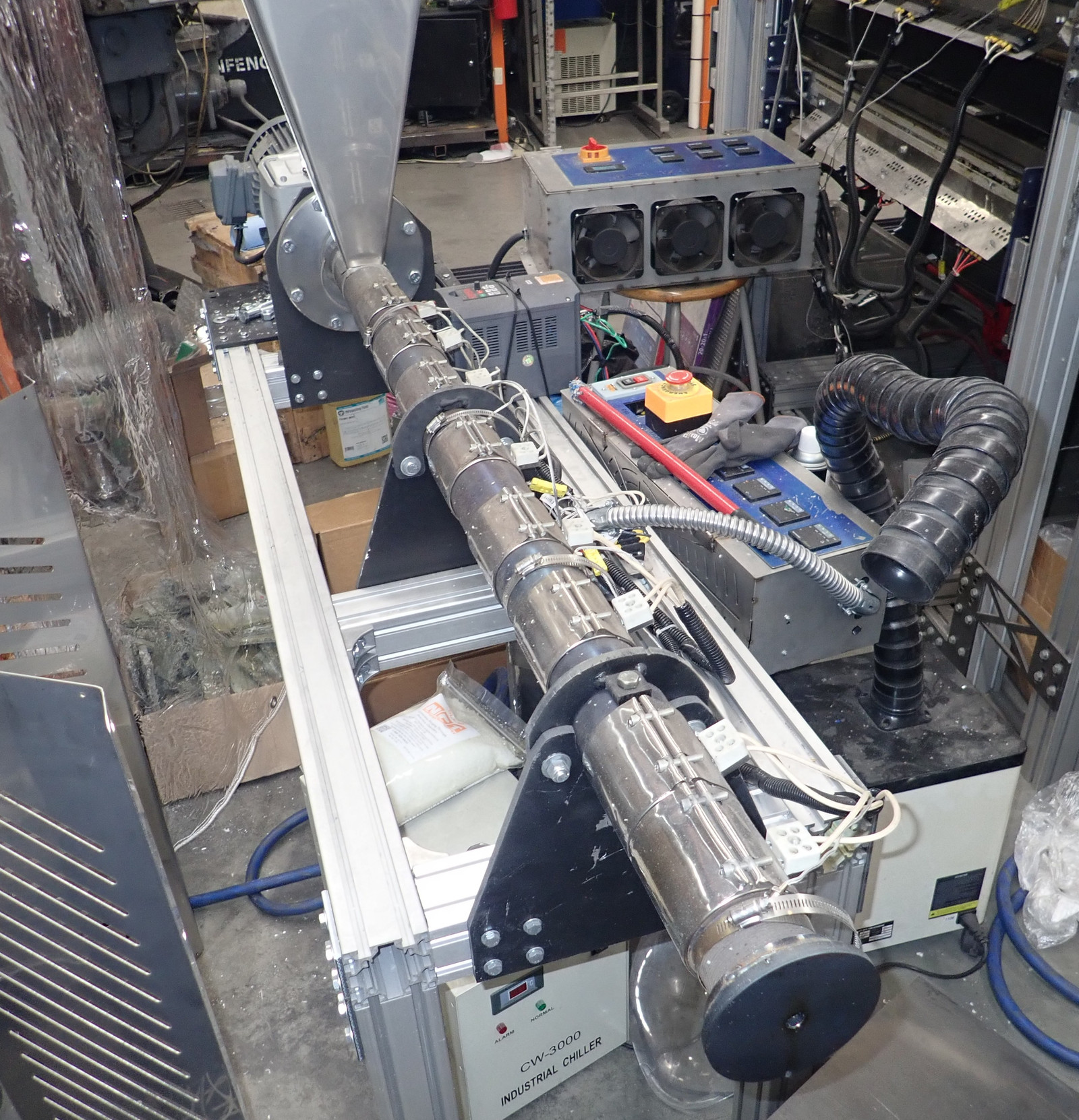 Another technique they’re playing with is extrusion - using a screw auger to really mix the plastics while they’re being heated, and then shoved at fairly high pressure into a mold. Here, the far end is a motor and gearbox, driving the auger. Chipped plastic is fed in the funnel and driven down the pipe. Wrapped around it, a range of heaters are clamped on to progressively heat the mix and allow it to flow together. If you’ve ever used a KitchenAid Pasta Extruder sort of gizmo, it’s like this - just with plastic.
