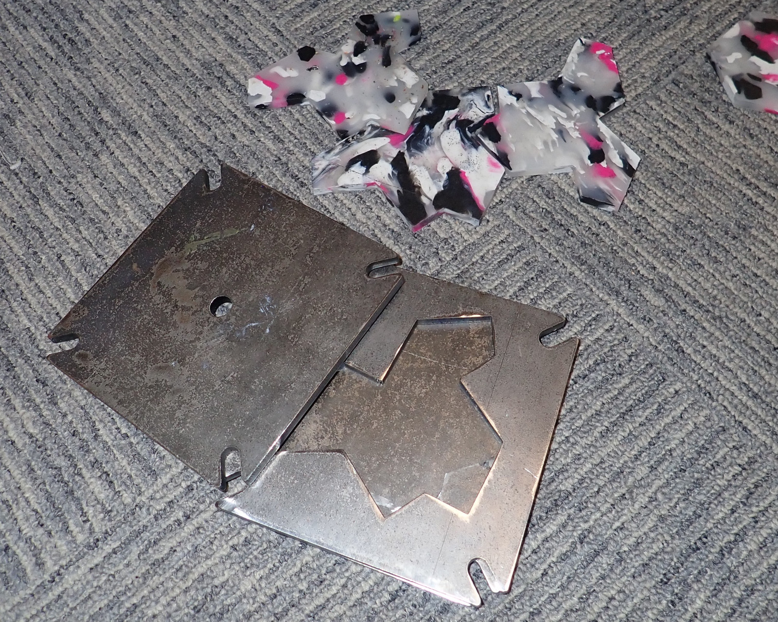 If you have a laser cutter, making molds isn’t hard at all! The molds they’ve been using are a three layer setup - one flat plate on the back, the actual shape in the center, and a front adapter with a hole that bolts up to the end of the machine. Build a mold, squeeze plastic in, cool it off, and pop it out!