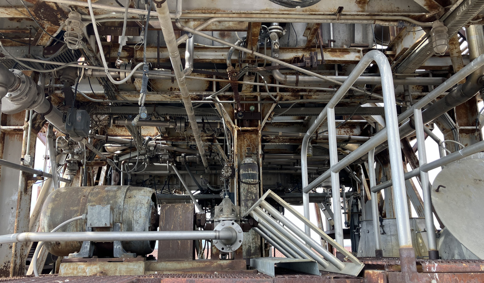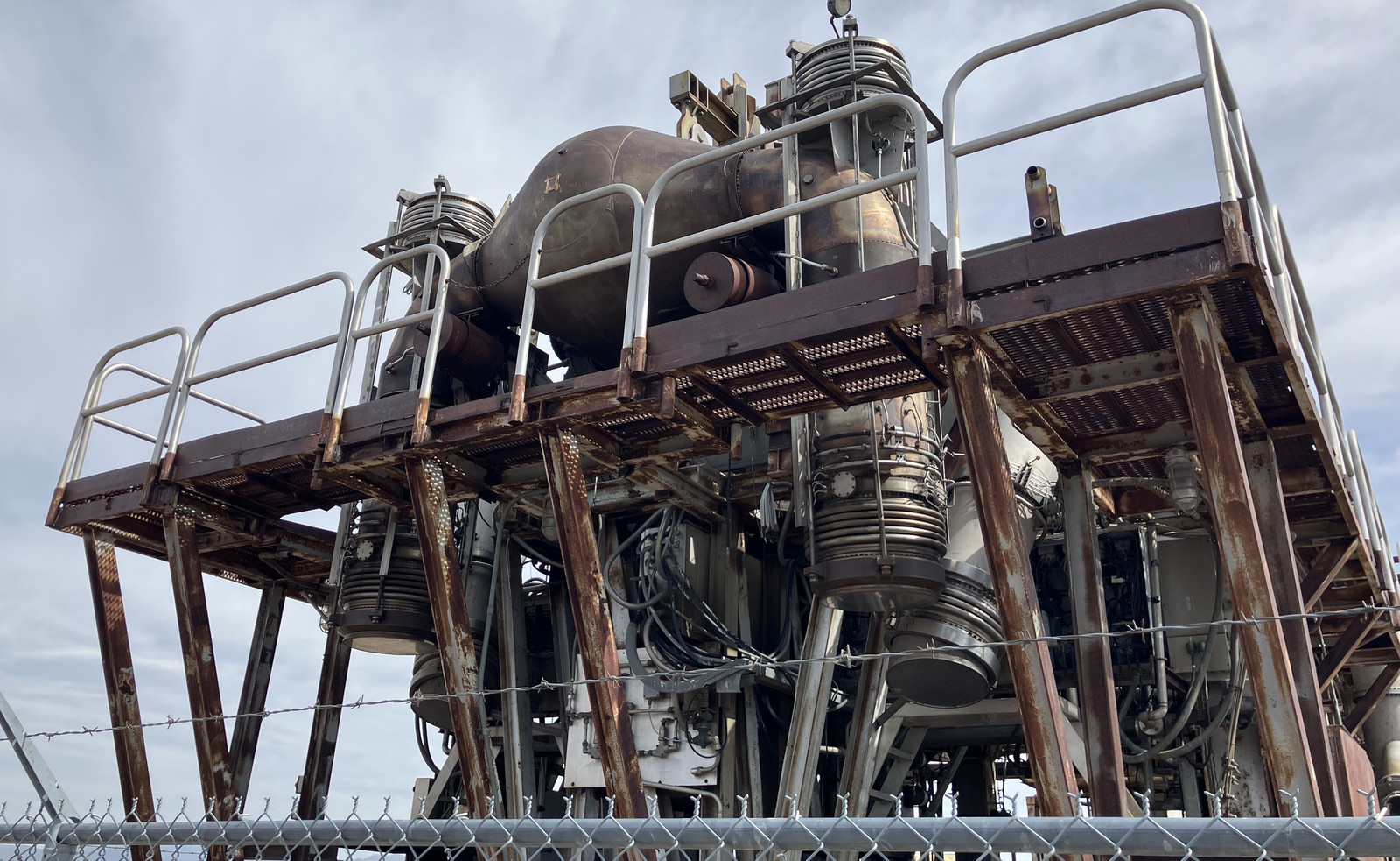 Notice how free floating this heat exchanger assembly is. Metal does expand as it gets hot, and this is something that needs to be handled in a system that deals with a wide temperature range. As far as i can tell, this assembly is supported to a fixed structure on every other tube, at the near end. Everything else is free to float and expand/contract as needed to keep stresses down. Given that the facility worked without problems for 12 years, it seems like a successful design!