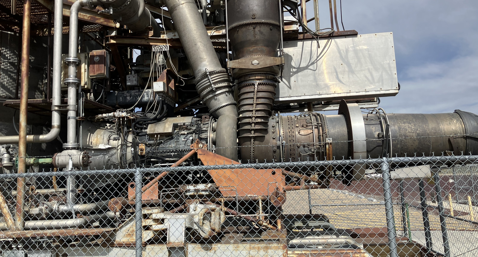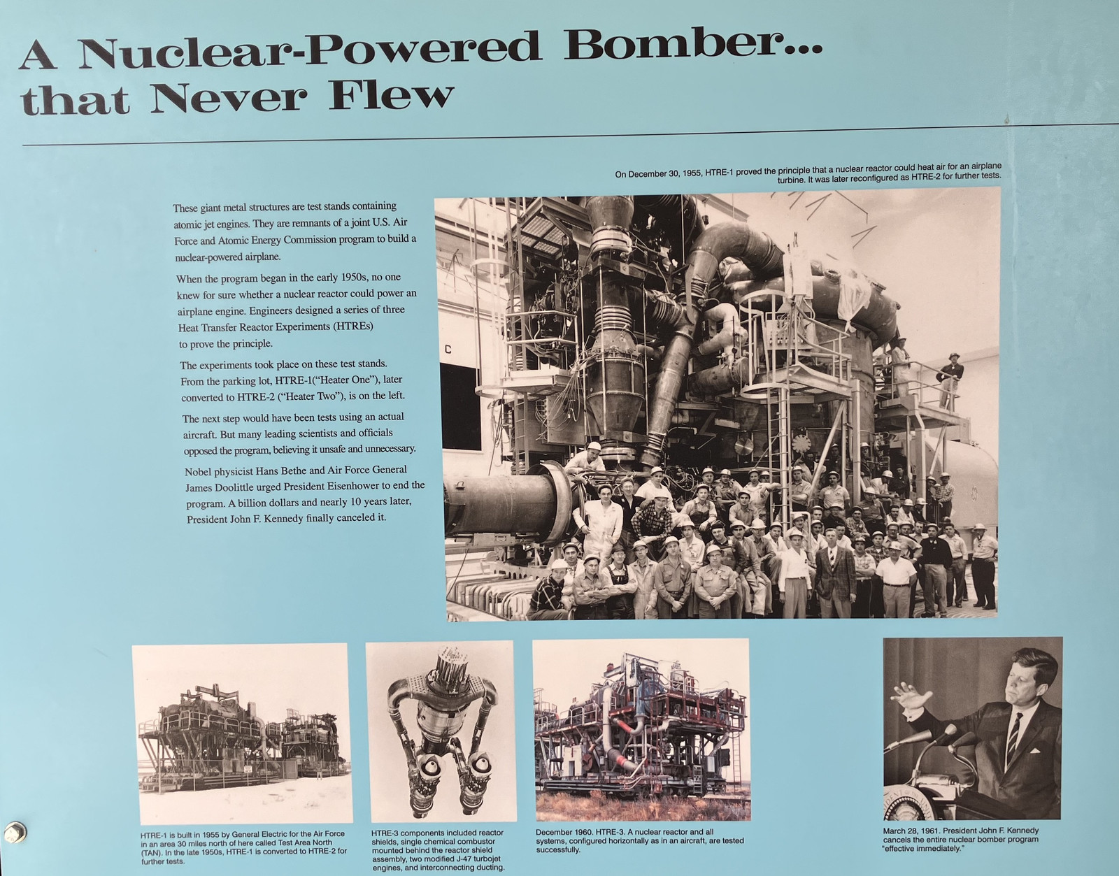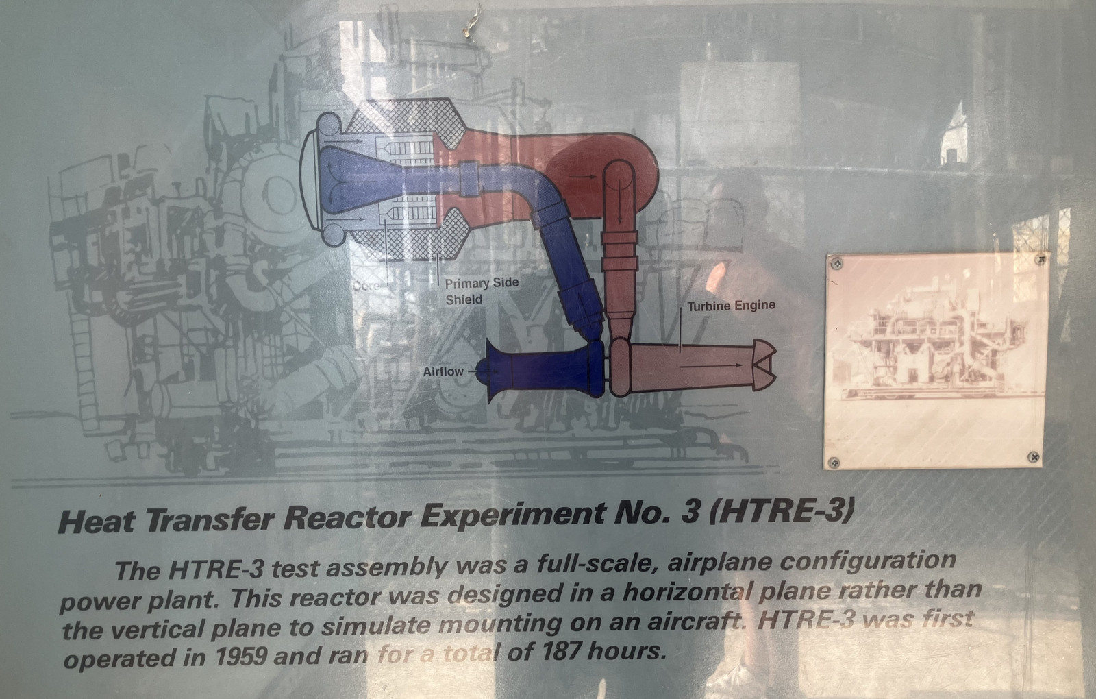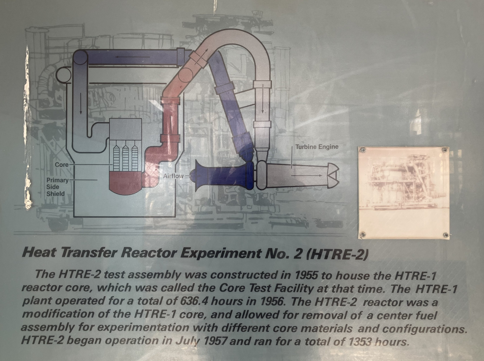 It’s hard to get good photos of some of the signs in the sun, but you can see the concept they used here - air is compressed, run through a long series of tubes to the reactor core, heated, and blasted out the turbine section of the jet engine. The jet section seems to be missing, though.