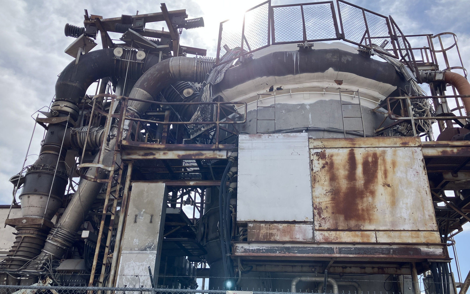 The pipes enter the round containment chamber, and I just like how this shot turned out with the sun behind the clouds, behind a bit of absurd machinery with some off kilter fencing. It would be perfectly at home in a lot of video games. There might even be secrets inside, though don’t stay too long or you start taking damage!