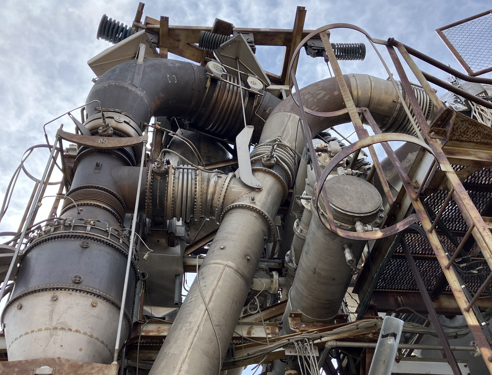 All of the connections and pipes have bellows in them to handle thermal expansion and contraction, which is reasonable when you’re moving very hot air around. There’s also what appears to be a bypass - the horizontal bellows about halfway up the photo. I expect the lever on the right hand pipe is connected some sort of flapper inside that controls if the compressed air flows into the reactor, or flows back to the turbine section, with the lever on the black “T” doing roughly the same. Per some documentation I found, the large can at the bottom is the combustion chamber that was used to start the engine on jet fuel before cutting over to nuclear power, and may simply be the combustion chamber they pulled from the engine, rotated and replumbed. In any case, this is a wonderful bit of absurd industrial piping project!