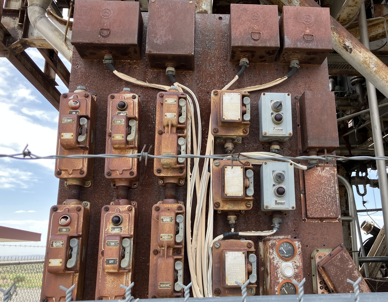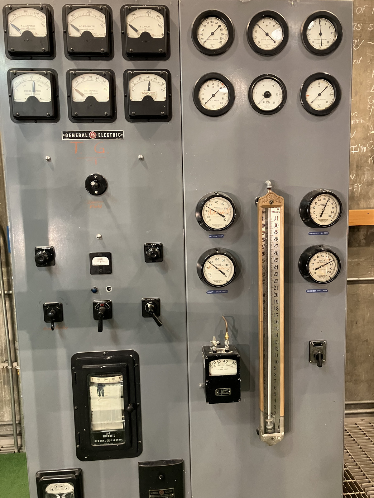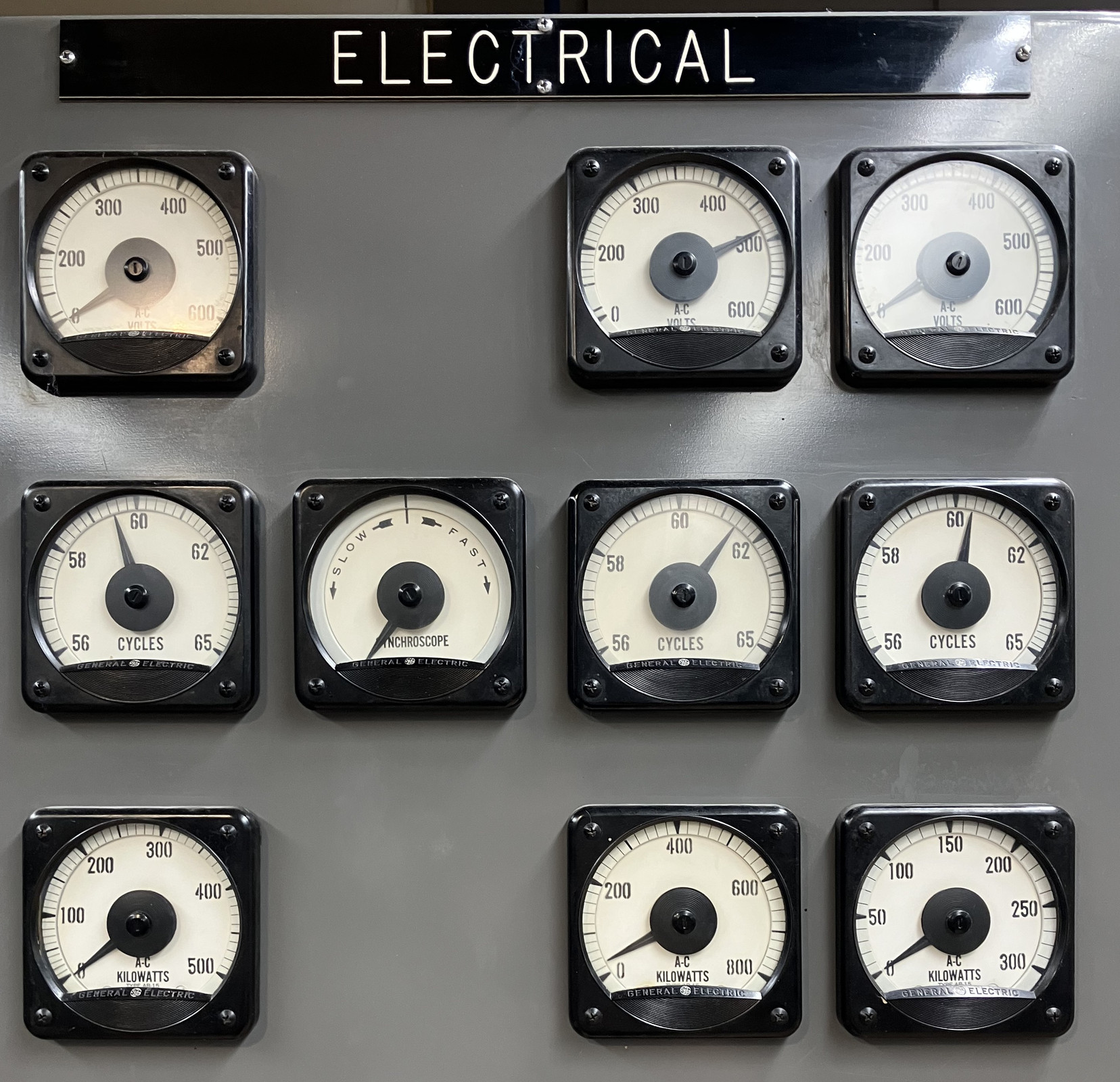 Another interesting clue is that along the bottom, the kW max of the gauges is different. On the left, the gauge peaks at 500kW. The center stack peaks at 800kW, and the right hand stack peaks at 300kW. I know from a later inspection of the generator that it’s a 300kW (375kVA - yes, power factor matters!) unit. My guess is that the left side indicates the parameters from the reactor’s generator, the far right is the external grid connection, and the center stack is the “combined plant use,” or something of that sort (since it could, if wired suitably, be pulling ~300kW from the grid and ~400kW from the generator). I don’t see how this would indicate if you’re net exporting, which EBR-I certainly did, but if you’re generating 300kW and only using 50kW, it’s reasonable enough to expect you’re exporting 250kW (and the right hand consumption gauge would probably be zeroed - or if it’s symmetrical, it might show 250kW - hard to say without talking to someone who ran the plant).