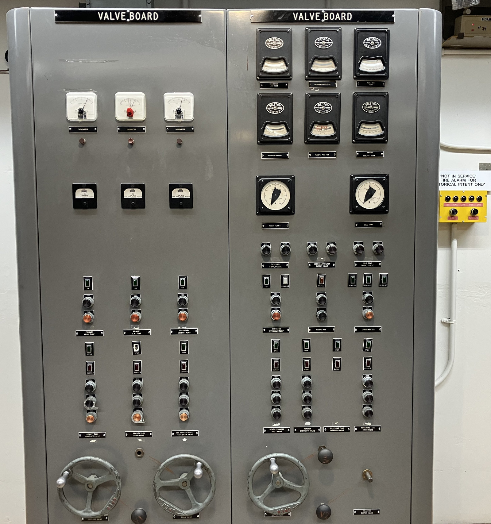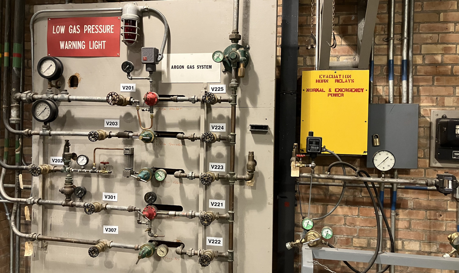 Over on one side of the first floor, there are another few fun systems laying around. There’s the argon gas system, which was, among other things, used to help isolate the heat exchanger loops from each other, and I believe also covered the coolant in the reactor (since NaK doesn’t get along with air, water, or much of anything else). It would seem that keeping pressure in those systems was really important. I also appreciate the “Evacuation Horn Relay” box, being on both normal end emergency power. It makes sense - when it’s time to get out, you really don’t want ambiguity!