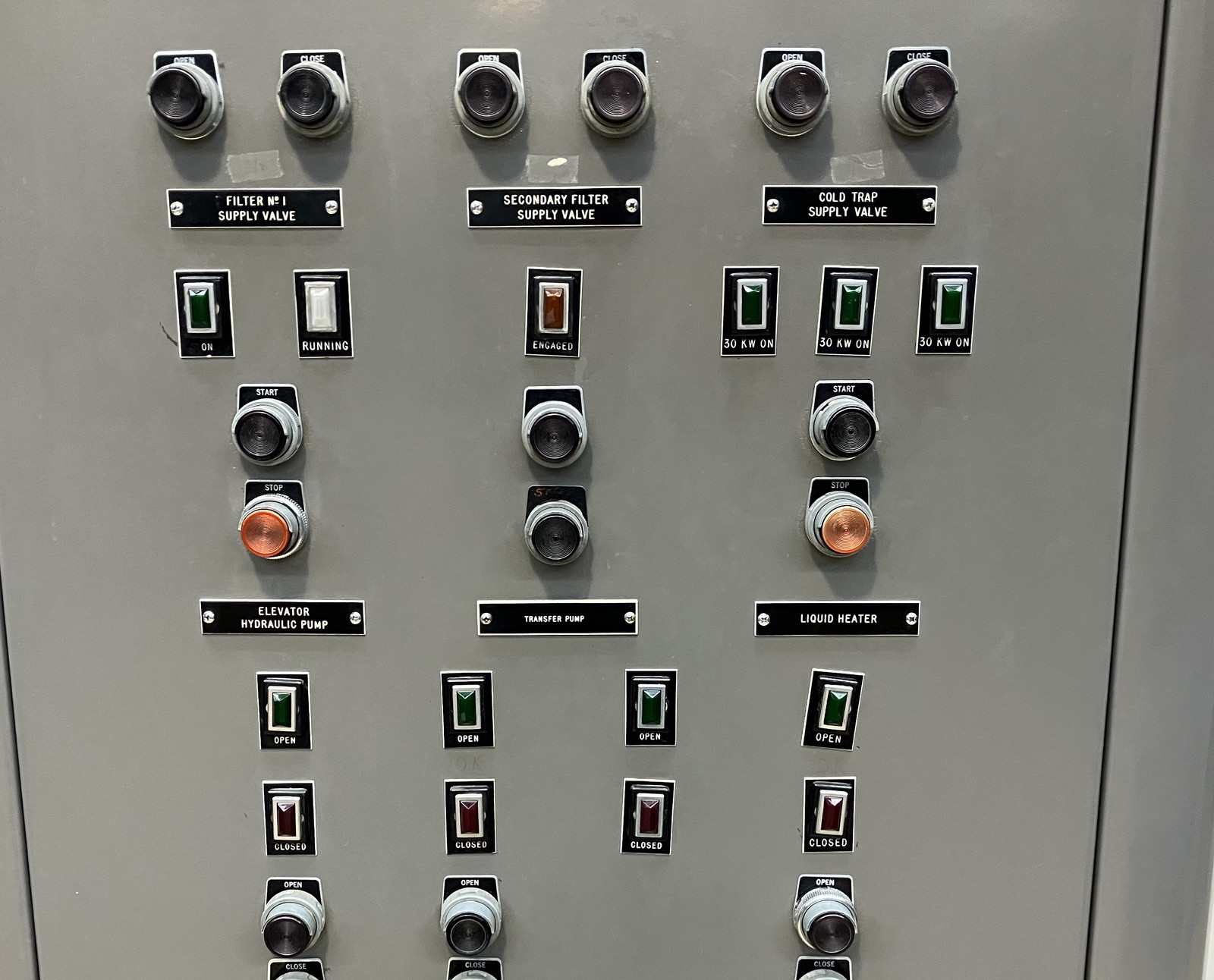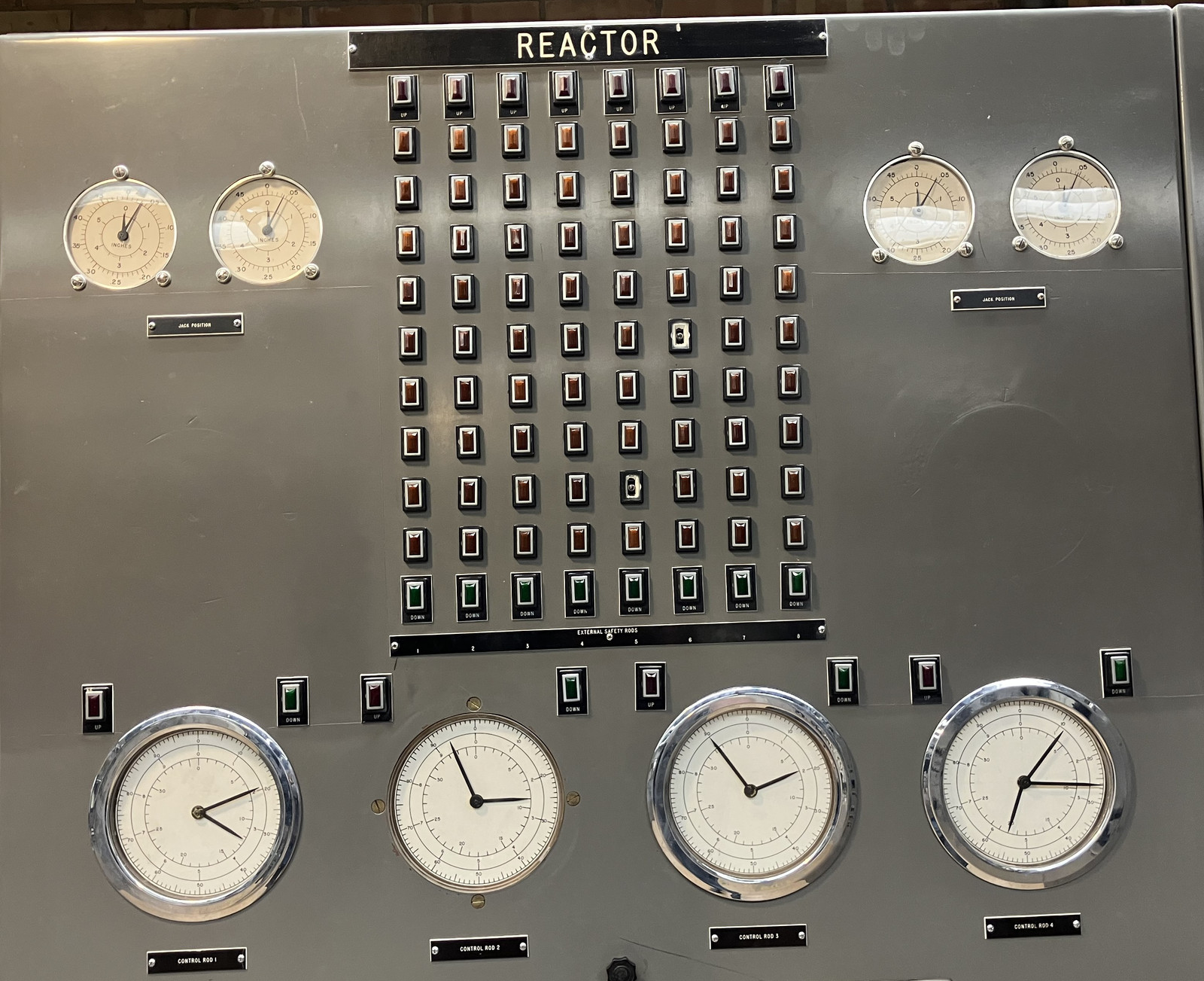 Finally, this panel shows the “control rod status” of the reactor. The lights indicate the position of the external safety rods, the lower “clocks” indicate the control rod positions, and the upper gauges indicate the “jack position” - which may be related to the outer breeding blanket position - I’m not actually sure.