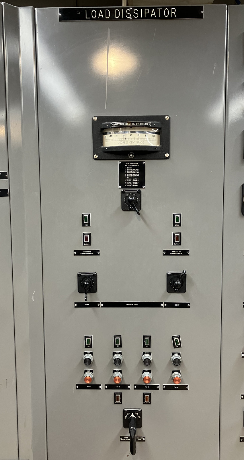For loading up the generator without exporting to the grid, EBR-I has a load dissipator, though I’d use the term “load bank.” This is just a big set of fan cooled resistors somewhere that can dump generated power. Instead of having one indicator for every probe, they have a rotary switch in the center that connects the single gauge to each of the assorted measurement points for intake and exhaust temperature. The bottom switch appears to toggle the load bank between the turbo-generator bus and the external bus, if you want to test the load bank on grid power.